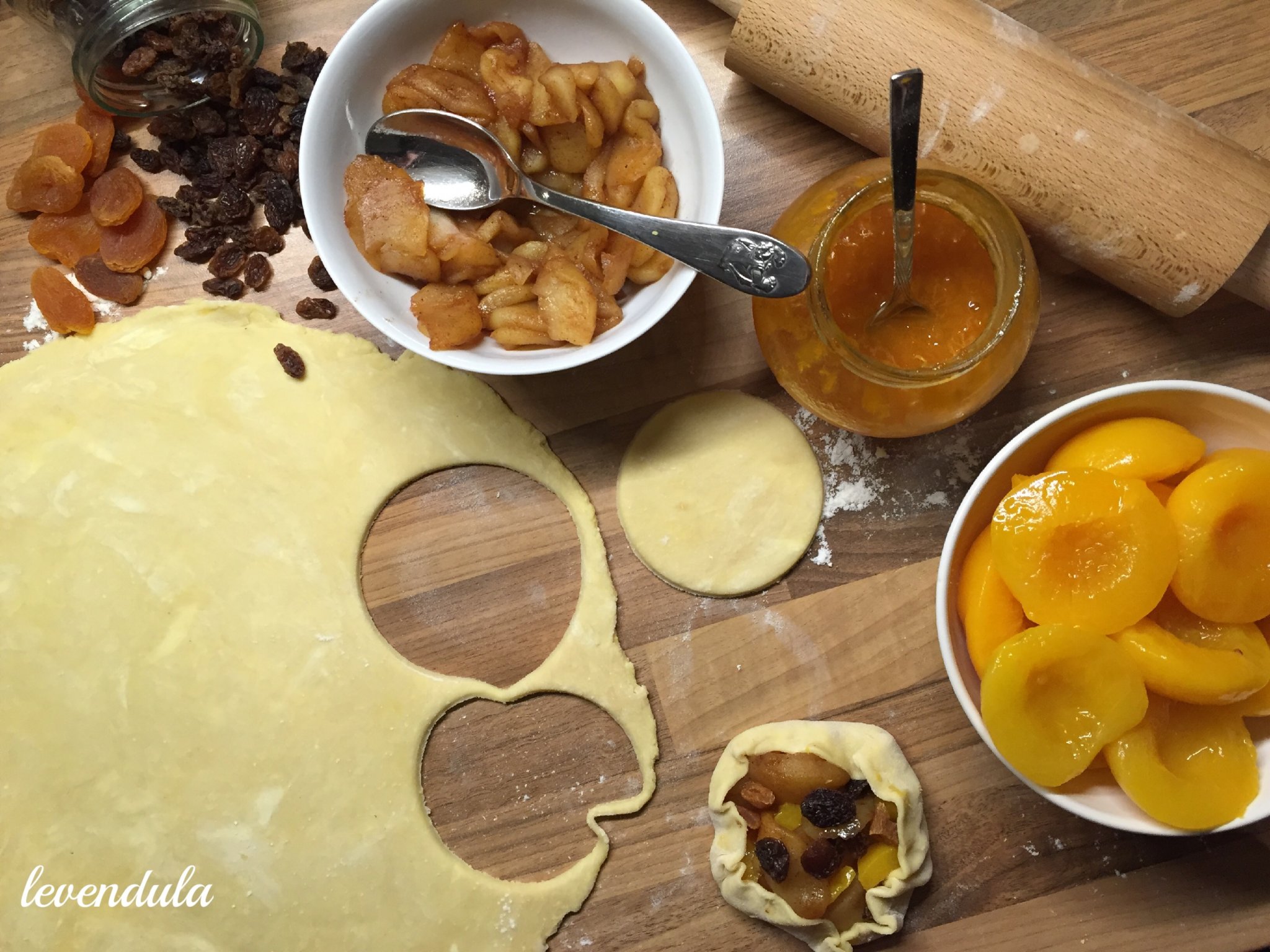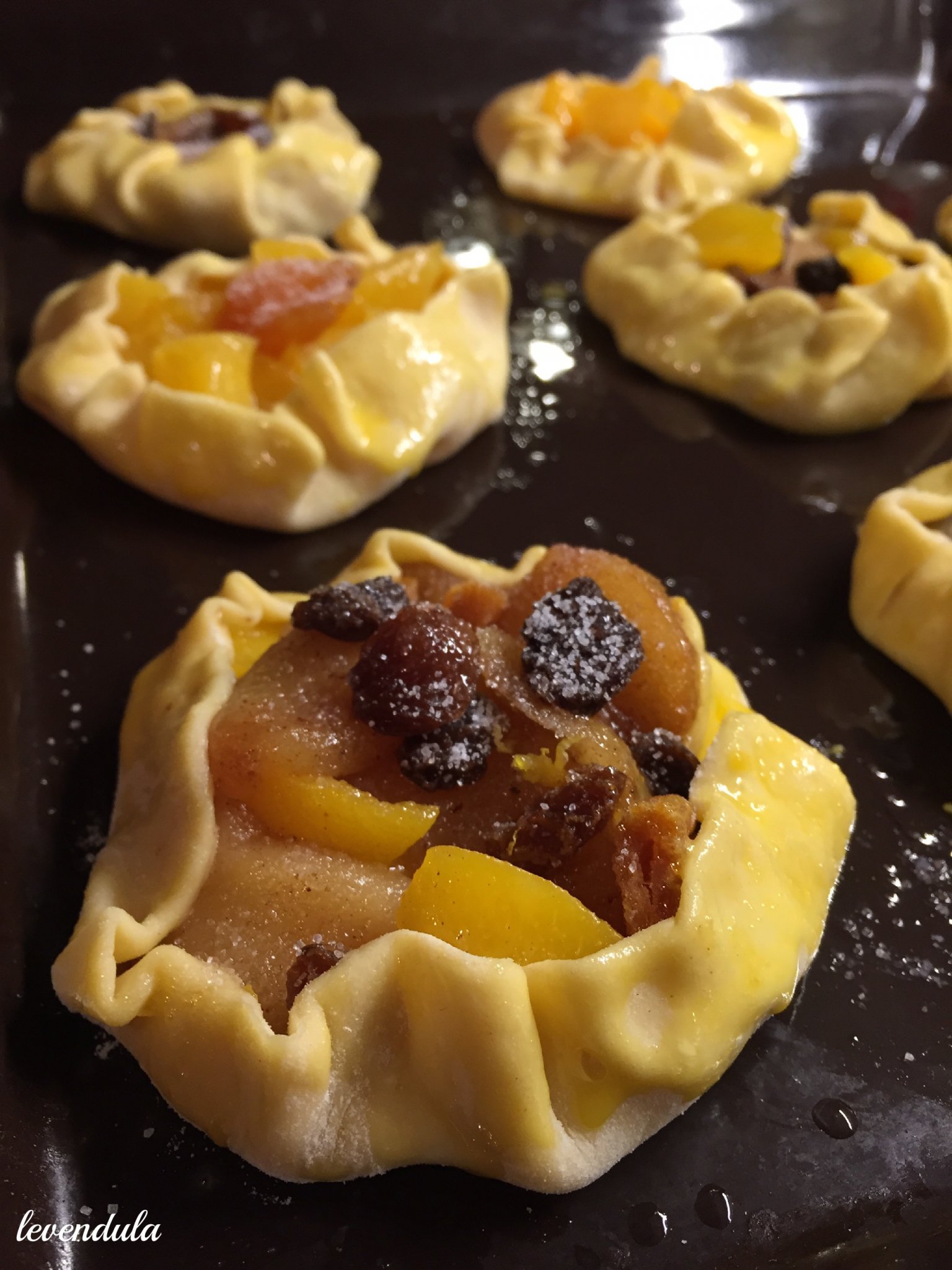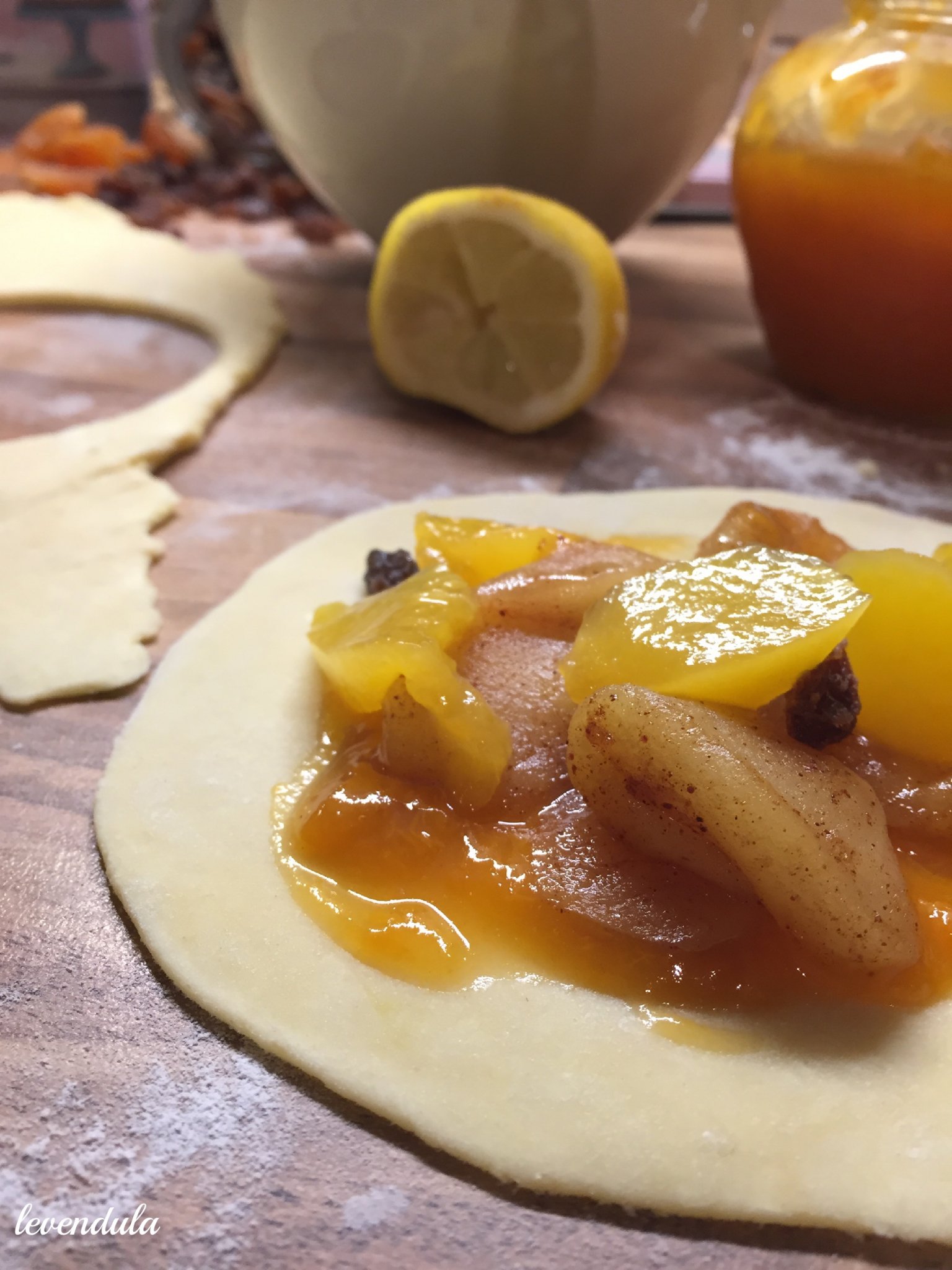 Kinyújtom kb fél cm-1 cm közti vastagra, majd nagy pohárral kiszaggatom. A kiszaggatott részt nagyobbra nyújtom és megtöltöm. Töltelékem fahéjas dínsztelt alma, konzerv barack, baracklekvár, mazsola, citrom pár csepp leve, vaníliás cukor, aszalt barack. Minden kosárka más lett! :-) A kiszaggatásból maradt tésztát visszatettem a hűtőbe, majd egy nagy galette készült belőle.