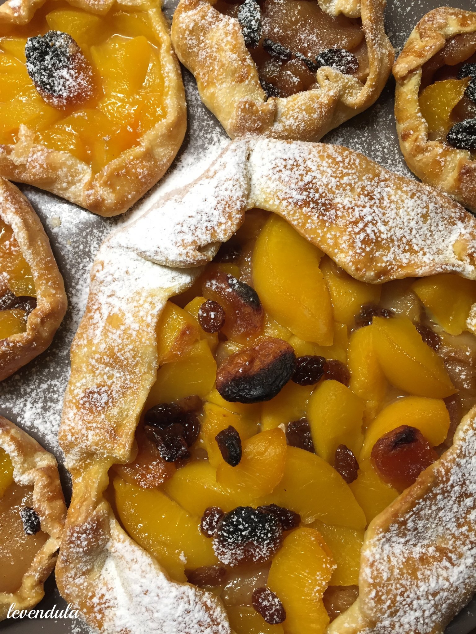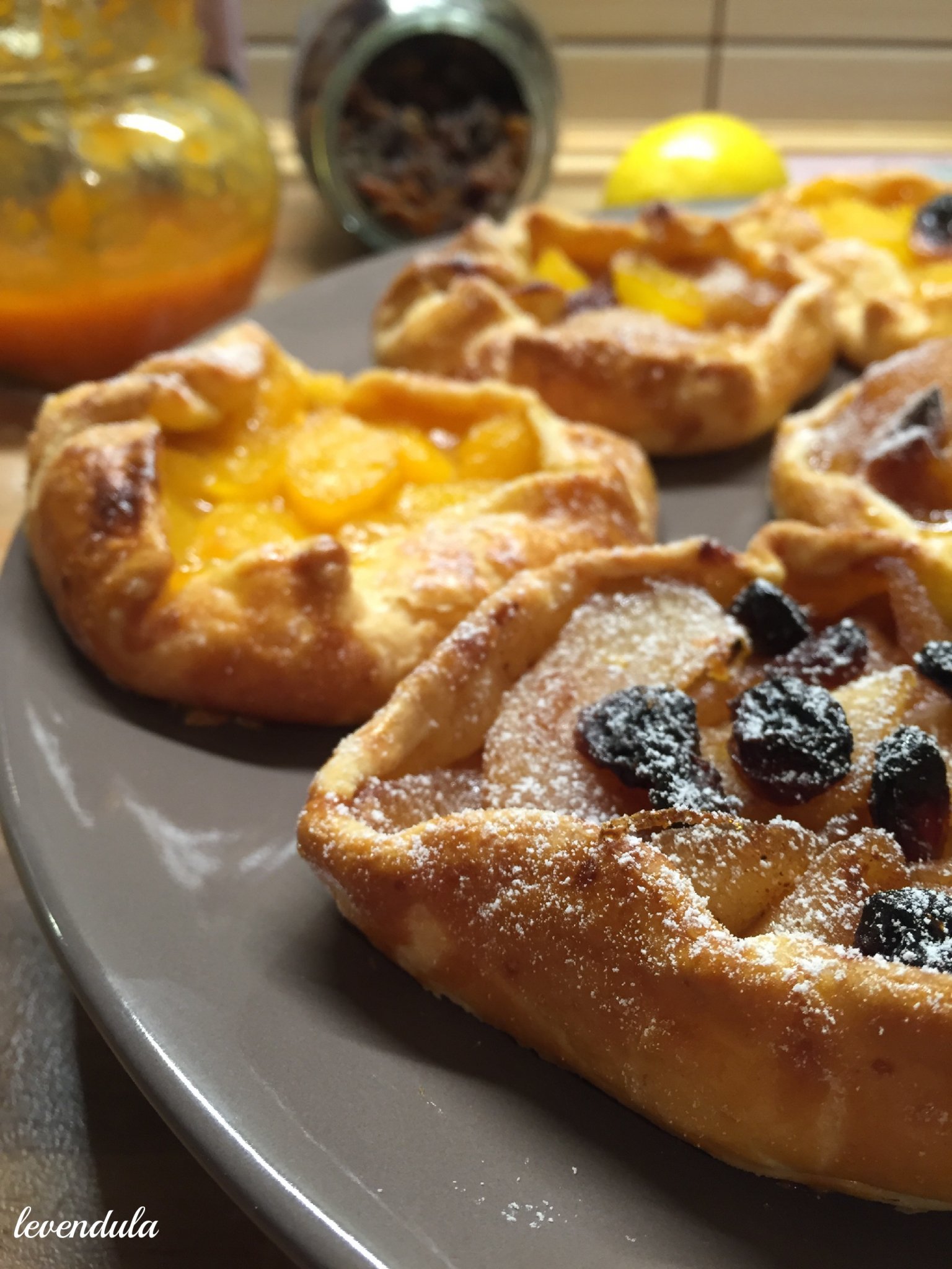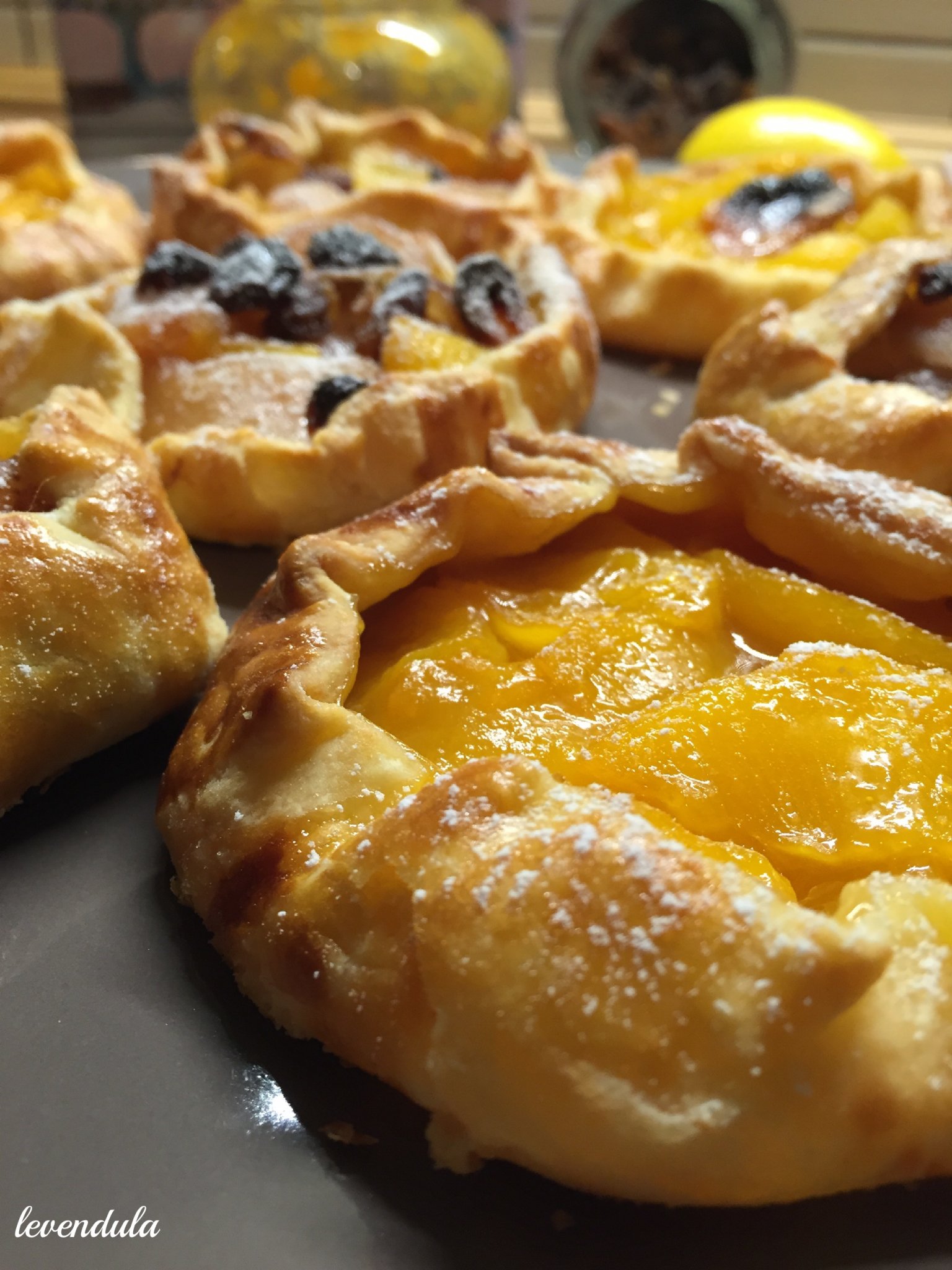 Kinyújtom kb fél cm-1 cm közti vastagra, majd nagy pohárral kiszaggatom. A kiszaggatott részt nagyobbra nyújtom és megtöltöm. Töltelékem fahéjas dínsztelt alma, konzerv barack, baracklekvár, mazsola, citrom pár csepp leve, vaníliás cukor, aszalt barack. Minden kosárka más lett! :-) A kiszaggatásból maradt tésztát visszatettem a hűtőbe, majd egy nagy galette készült belőle.