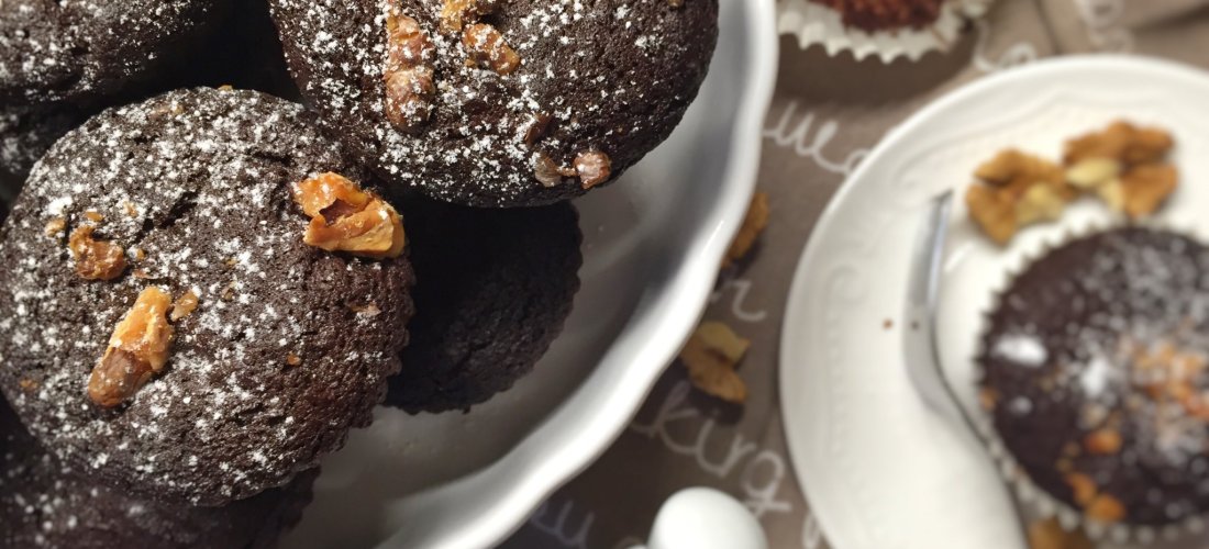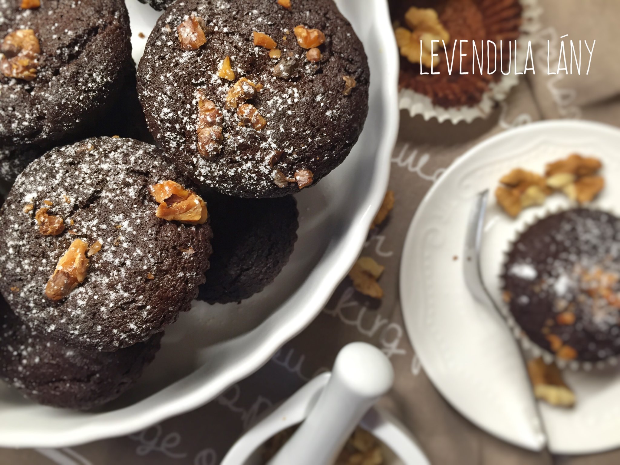 A lisztet, a sütőport és a kakaóport összekeverem egy tálba. Egy másik tálba a tojásokat habosra keverem a cukorral, az aromákval/ vaníliás cukorral, a tejjel, az olvasztott margarinnal és a lekvárral. A lisztes keveréket szépen lassan csomómentesre keverem a masszával. Hozzáadom az összevágott csoki darabokat is. Tört dióval sütés előtt megszórom. 180 fokon 20-25 percig sütöm.