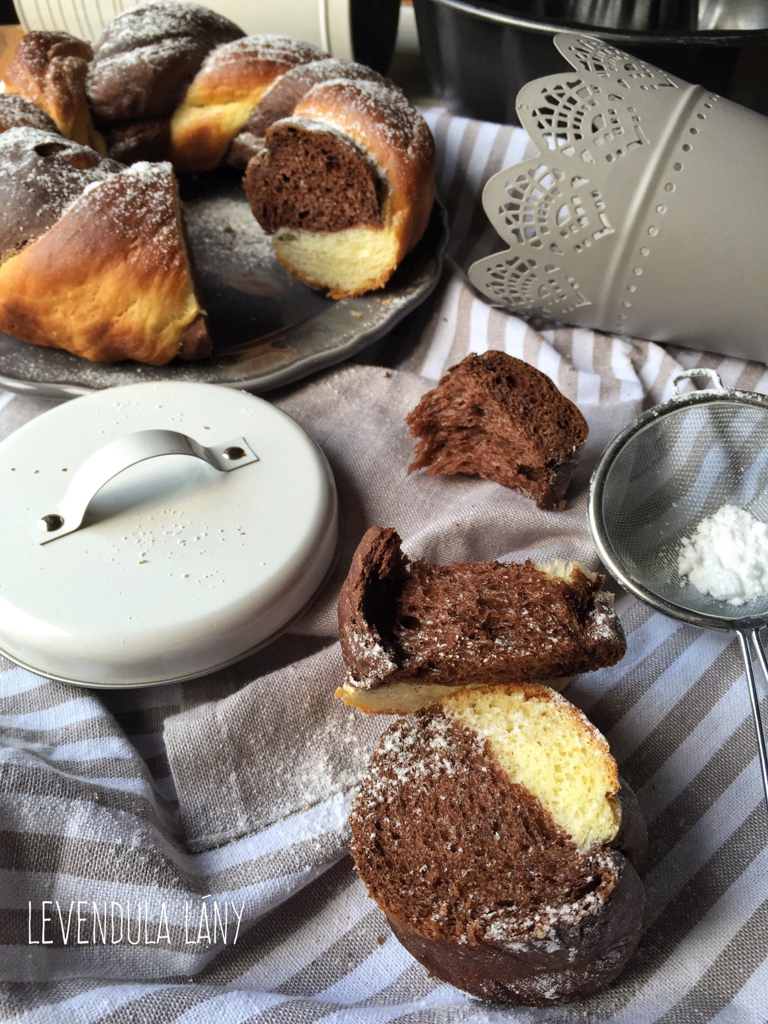 Közben kimérem a lisztet, a porcukrot, a csipet sót. Ha felfutott az élesztő a lisztes keverékhez öntöm, a tojássárgáját és az olvasztott vajat is hozzáadom. Tesztávó gyúrom, majd dagasztom, amit én a robotgép dagasztó karjával szoktam. A dagasztás végén 2 részre osztom a tésztát, az egyik adagba beleteszem a kakaóport, meglöttyinem kis tejjel, majd összedolgozom.