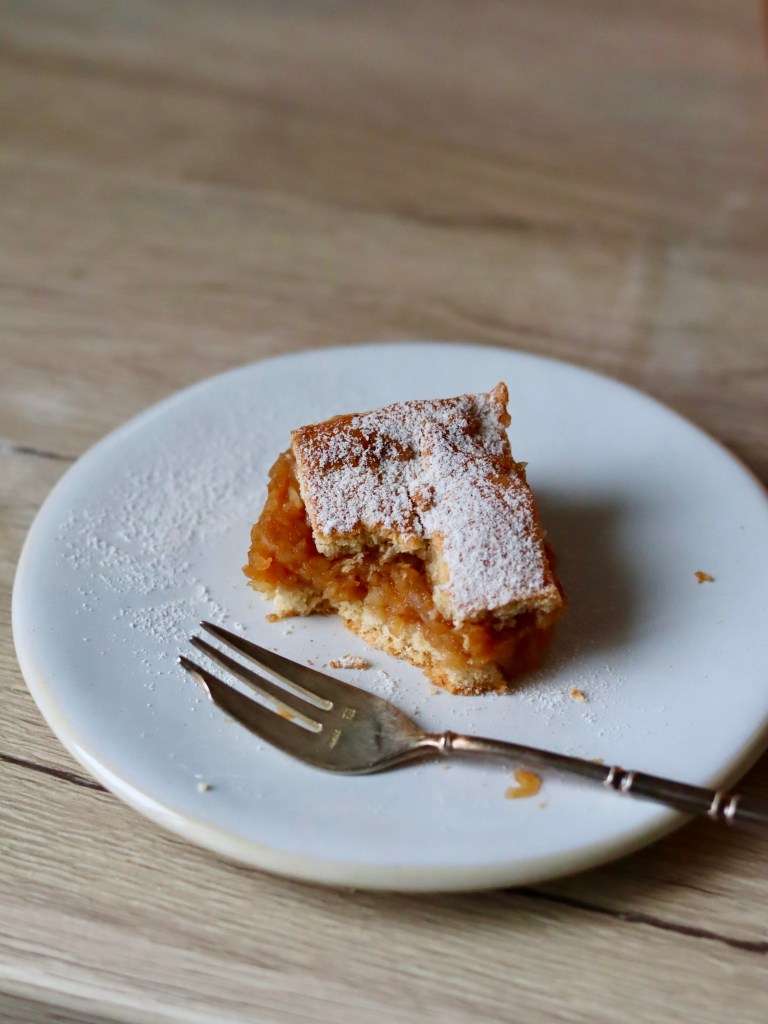 Mehl, Salz, Backpulver und Puderzucker in in einer Rührschüssel mischen. Die kalte Butter in kleinen Stückchen darauf geben und zerkrümeln. Zusammen mit dem Ei (nur 3/4 des Eies zum Teig geben, den Rest zum Bestreichen des Kuchens) und Sauerrahm zu einem homogenen Teig verkneten. Aus dem Teig zwei Kugel formen, in Frischhaltefolie wickeln und für 1 Stunde kühlen lassen. Die Äpfel schälen, entkernen und reiben, mit Zitronensaft abgießen, und stehen lassen. Backofen auf 180 Grad Ober- und Unterhitze vorheizen.