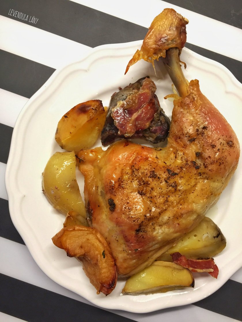 - Az almát megmostam, eltávolítottam a magházát, negyedeltem és a máj mellé benyomtam.