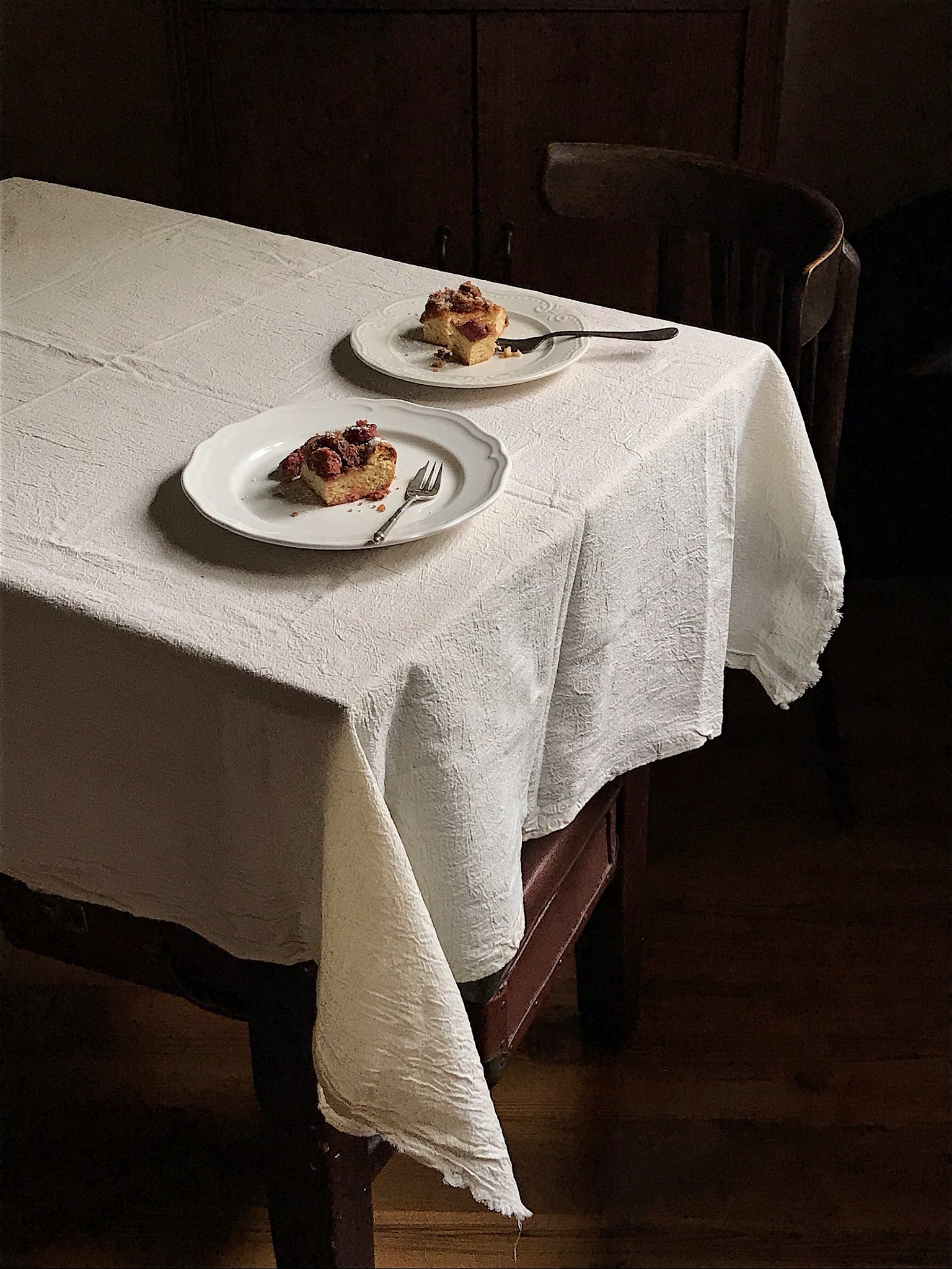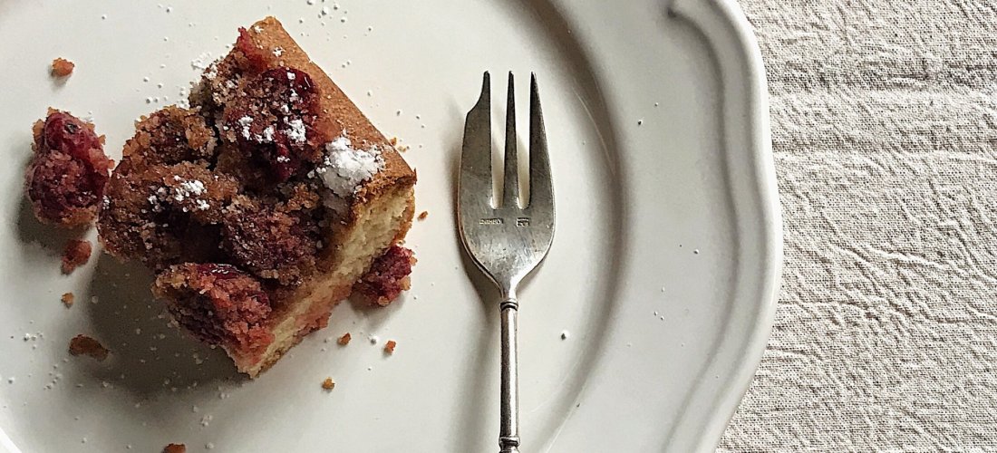 Cseresznyés lepény, amolyan kis aranygaluskás beütéssel, köszönhetően a tetejére szórt darált diónak. Például igazán el tudnám képzelni tálalásnál egy tojásos borsodóval párosítva. Tésztája egy igen tartalmas, zsírosabb fajta kelt. Nem az a ‘boltikalács’ foszlós, hanem az a szaftosabb jellegű, tovább puha fajta. A tészta szerkezetéhez a világos tönkölybúzaliszt is hozzájárult, magasabb fehérjetartalma erősebb gluténhálót/sikérvázat képes kialakítani = lyukacsosabb, levegősebb tésztánk lesz.