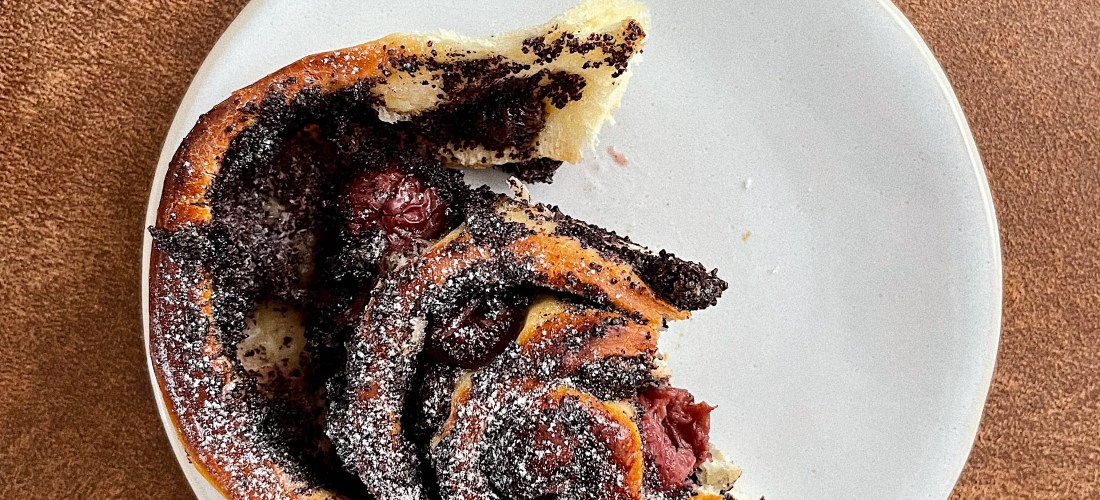 Szóval ez volt a terv, sütni éppen nem terveztem, mert a héten sütött aranygaluska cruffinból és diós kalácsból még van a fagyóban egy kevéske, gondoltam, majd azt előveszem és a kalács egy mennyei finom French Toast formájában fogy majd el. Ezt az elképzelt szombatot egy reggeli gondolat törte meg: fahéjas csigaaaa??? Mentem is ki a konyhába és begyúrtam a fahéjas csiga tésztáját. Aztán ahogy kelt a tészta, mentem megágyazni és eszembe jutott, hogy van itthon a fagyóban mák, mi lenne ha… és hoppá meggy is van! Zseni.