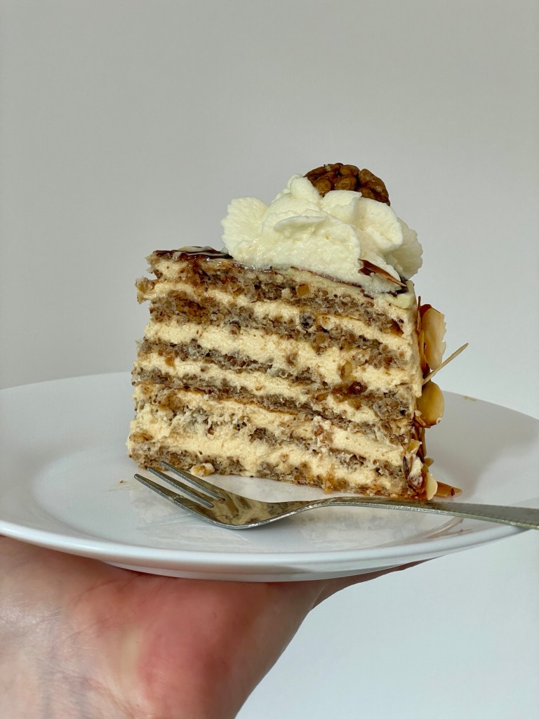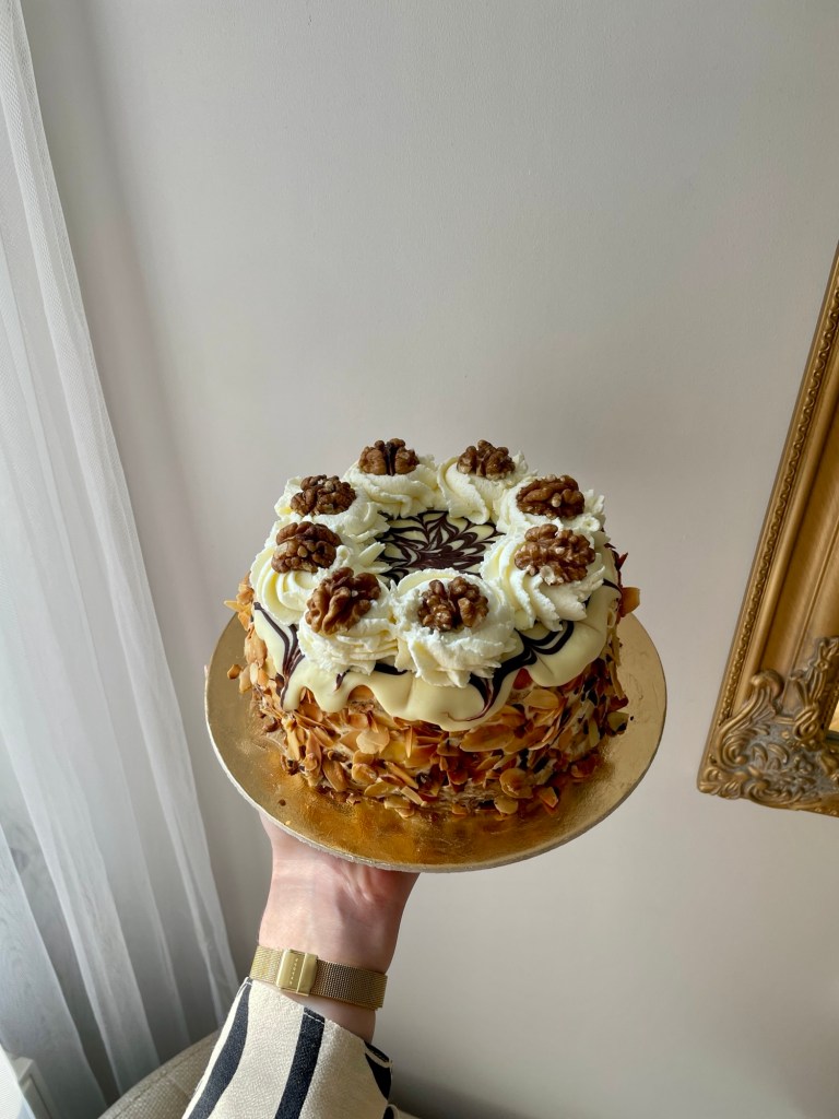 A torta lelke a klasszikus, főzött vaníliás diós vajkrém, amelyben minden falatban ott van a régi cukrászdák eleganciája. A krém alapja: – tojássárgája – liszt és keményítő – vaj – vanília – pirított dió – plusz egy kis rum vagy konyak, ami kerekíti és elmélyíti az ízeket