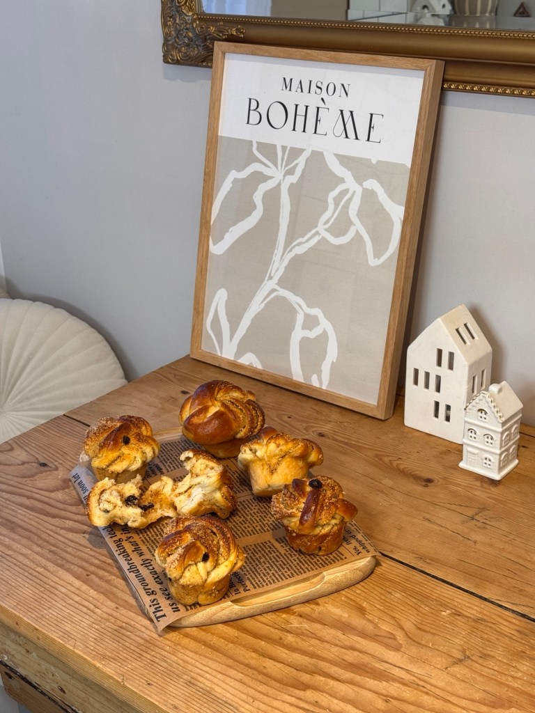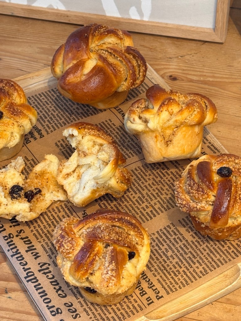 A megkelt tésztát lisztezett deszkán 40×50 cm-esre kinyújtjuk. Lekenjük az olvasztott vajjal, majd a pirított, aprított mandulával, megszórjuk a cukorral és a mazsolával is. Az alsó részét felhajtjuk az alsó harmadik, a tetejét ráhajtjuk, majd 8 egyenlő részre vágjuk. Minden darabot bevágunk úgy, hogy 3 szállal be tudjuk fonni. Befonjuk és feltekerjük, majd kivajazott muffin formába tesszük, 40 percig pihentetjük, majd lekenjük kicsit felvert tojással és 180 fokra előmelegített sütőben 25 perc alatt csodásan aranybarnára sütjük.