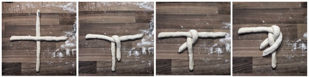 Négy kalácsszálat fonunk. Az egyik kedvenc fonás variációm, amit szerintem sűrűbben kellene használnunk, mert amennyire mutatós, nem mellesleg.. annyira egyszerű. Ehhez nem kell megnyitnom a youtube-ot és sűrű pause-play gombok nyomogatása közepette fonogatni, mint például egy hatosnál. Ha 500 g lisztből készítünk kalácsot, én 12 darabra veszem, így 3 db kis 300 grammos kalácskám lesz.