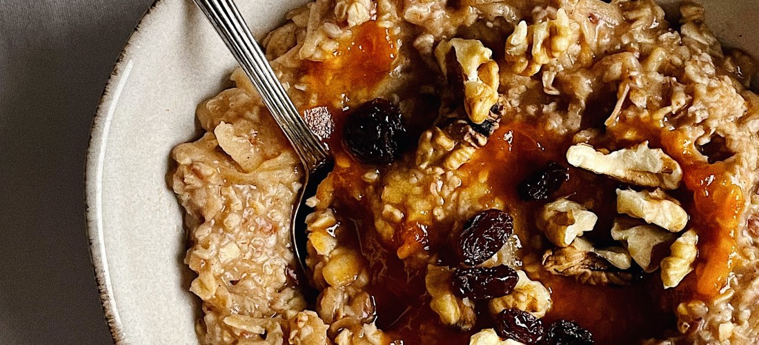 Krémes meleg, növényi alapú, tartalmas reggelit hoztam. Jobban eltelít és tovább kitart, mint egy saját készítésű, teljes kiőrlésű rozsos zsemle humusszal és zöldségekkel, amit sosem gondoltam volna, de 11 hét munkahelyi teszt-tapasztalat alapján kijelenthetem, hogy nekünk bevált. Kedvenc zabkásámat egy teáskanál lekvárral édesítem, pár szem mazsolával és dióval szórtam.