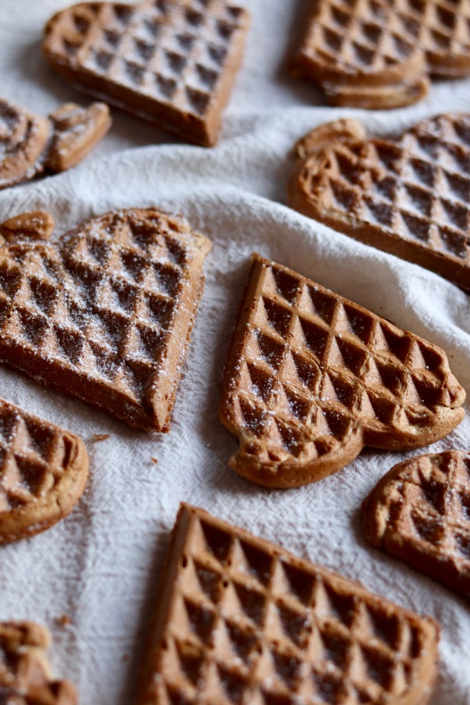 A száraz hozzávalókat összekeverjük. A lisztet elkeverjük a sütőporral, a fűszerekkel (fahéj, szerecsendió) és egy csipet sóval. Kettéválasztjuk a tojásokat, a sárgáját elkeverjük a tejjel. A tejhez keverjük a vanília aromát. A tojásfehérjét a kristály és a vaníliás cukorral habbá verjük. A vajat megolvasztjuk. A lisztes keveréket csomómentesre keverjük a tejjel, majd a vajjal is, végül beleforgatjuk a fehérjehabot. Gofrisütőben kisütjük őket. A kész gofrikat rácsra tesszük, hogy alulról is szellőzni tudjanak, ne puhuljanak be a nedvességtől.