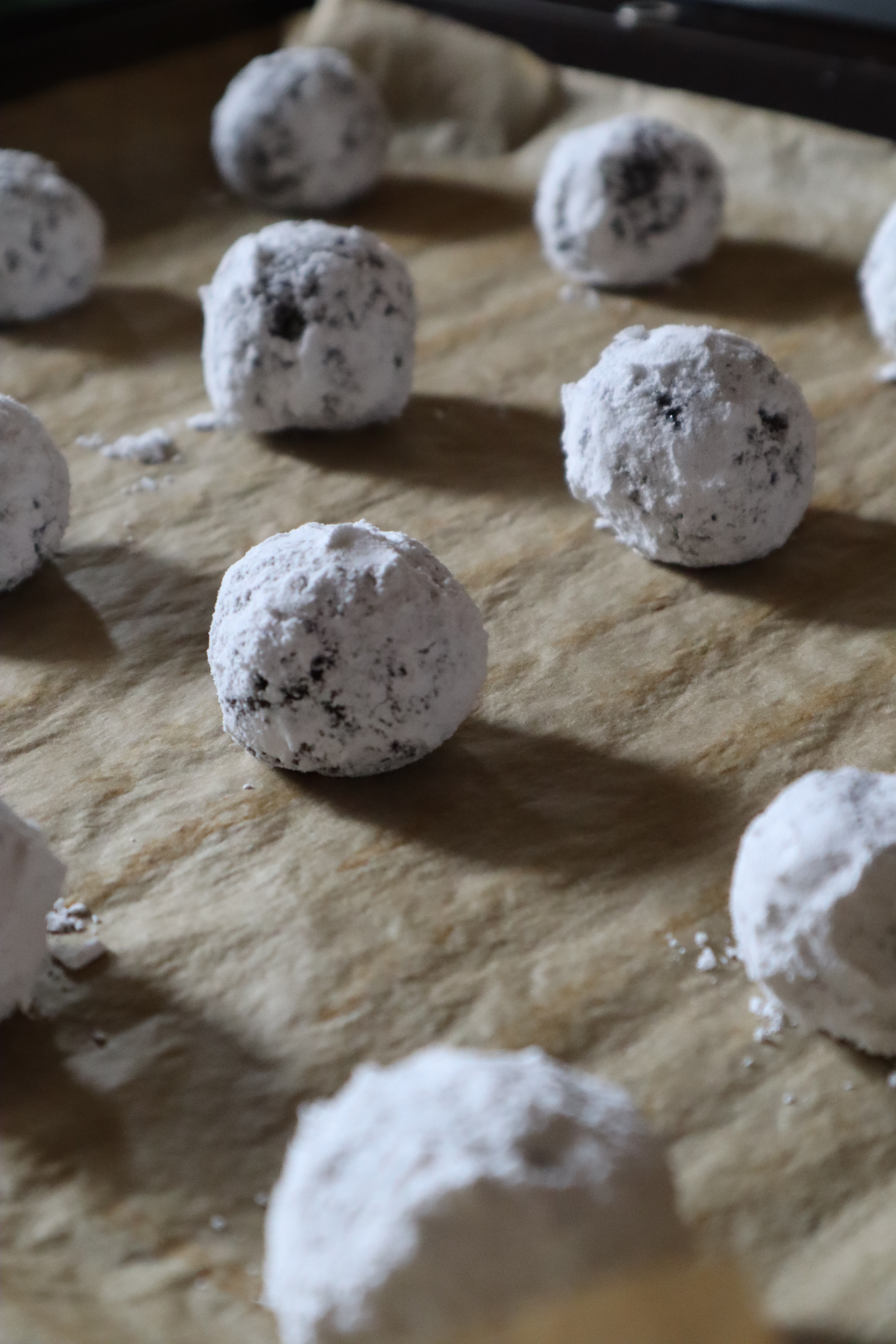 Az étcsokoládét a vajjal mikróban felolvasztom. (Félpercenként kiveszem és megkeverem.) A cukrot a tojással fehéredésig keverem, belekeverem a közben langyosra hűlt csokis vajat és a vanília aromát. Kimérem a lisztet, hozzáadom a sütőport és a szódabikarbonát, majd a lisztes keveréket belekeverem a csokis masszába. 170 fokra előmelegítem a sütőt. Sütőpapírral bélelt tepsire kb. 1 evőkanálnyi halmokat teszek két kanál segítségével. Ha felmelegedett a sütő mehet be és 10-11 perc alatt gyönyörűen szétrepedeznek és megsülnek.