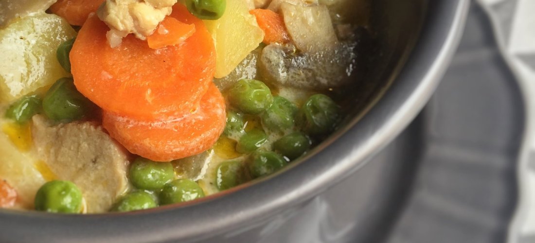 A zöldségeket megtisztítom és felkarikázom. A karalábét felkockázom. Kis zsíron, vagy olajon vagy vajon pirítani kezdem a felszeletelt zöldségeket (fehér és sárgarépa, karalábé). Hozzáadom a borsót. A vöröshagymát megtisztítom és egészben hozzáteszem. Beleteszem a combokat is. Felöntöm kb 2 dl vízzel. Fűszerezem. Ha forr felöntöm annyi vízzel, amennyit enged a lábas. Amint elkezd forrni lentebb veszem alatta a lángot és takarékon főzöm addig, amíg a hús megpuhul.