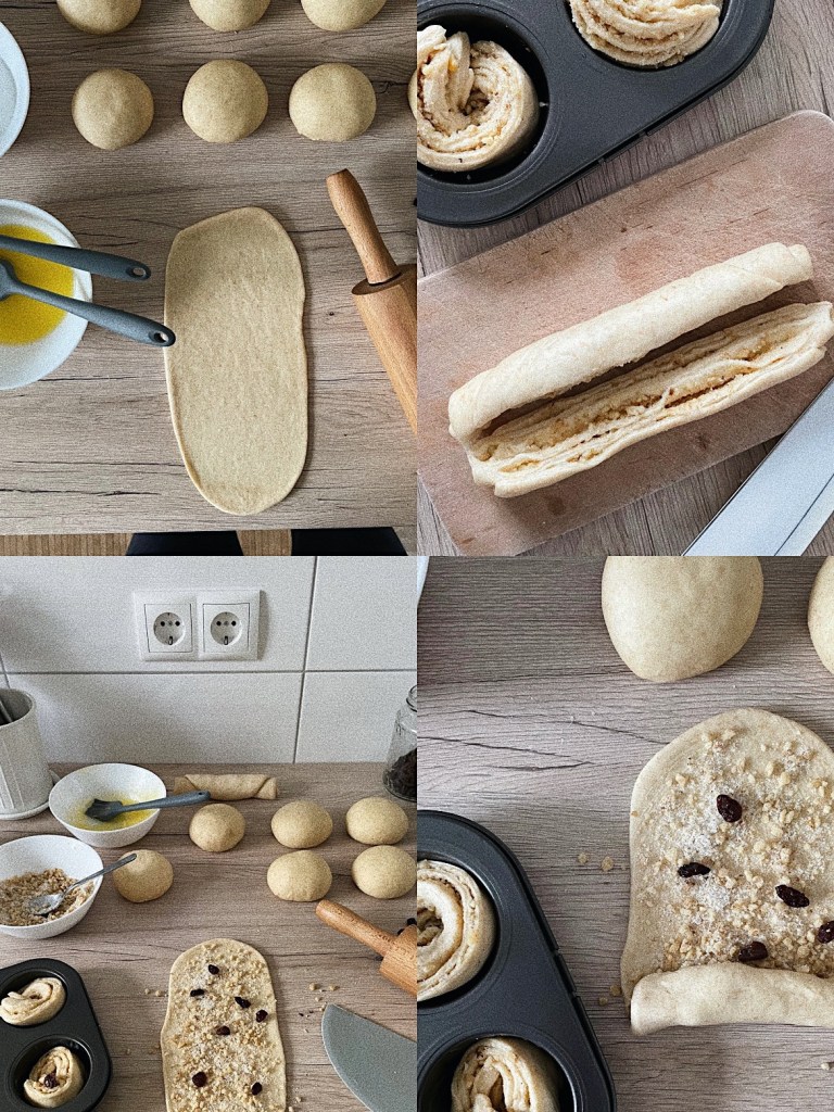 A tésztához a lisztet az instant élesztővel, a sóval, a kristály- és a vaníliás cukorral kimértem és összekevertem a robotgépem táljában. A langyos tejet elkevertem a felvert tojás háromnegyedével, majd hozzáöntöttem a liszthez, hozzáadtam a vajat és fényes tésztát dagasztottam. Letakarva a duplájára kelesztettem kb 1 óra alatt, majd szemmel 6 egyenlő részre osztottam, gömbölyítettem őket és 20 percre ismét letakartam és hagytam őket pihenni. Ezután egyenként kinyújtottam őket, olvasztott vajjal kentem és megszórtam a mazsolás cukros dióval, rövidebbik végétől feltekertem, kicsit sodortam és kettévágtam őket, majd a kivajazott muffin formába csavartam. Tetejét a maradék tojással kentem. Keltek még fél órát, majd 180 fokos sütőben (alsó-felső) kb 15-17 percig sültek. (A mellette sütött kalács összesen 35-40 percig volt bent.)