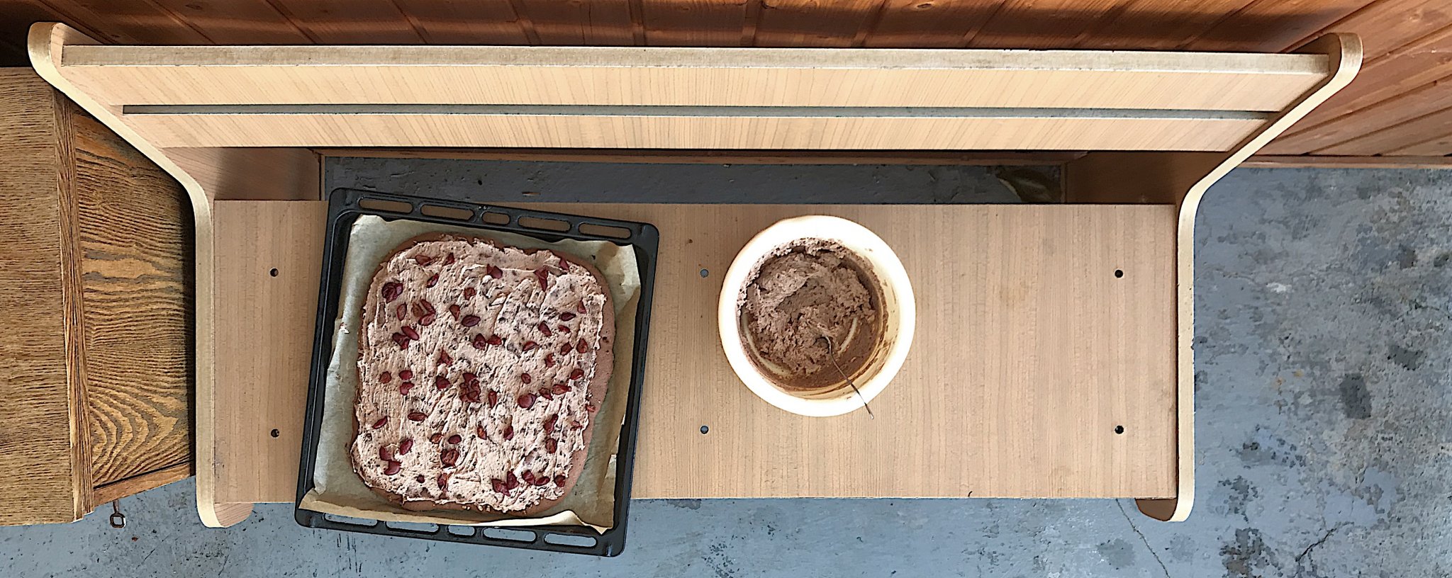 Összeállítás. A kimért meggyet apró darabokra vágom (ah mi nem vágtuk fel, hiba, volt, mert alig lehetett szeépen felszeletelni, hogy ne húzzuk ki az egész meggydarabokat a késsel..), hogy szeletelés közben ne okozzon gondot. A kisült piskóta tetejére vékony rétegben rákenek egy picike krémet. Megszórom a meggydarabokkal, majd jöhet rá a többi krém, amit kenőkéssel szép egyenletesre elkenek. Kiviszem az udvarra (télen) vagy beteszem a hűtőbe dermedni.
