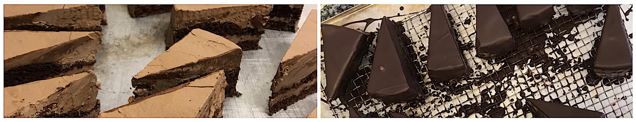 Cukrászdában nincs sok munka – alapon kiválaszthattunk egy-egy tételt a cukrászvizsgából (ami egyébként pont idén vált betyár nehézzé*) és elkészíthettük, egyedül – jó, vagyis persze, jól megkonzultálva, fejeket összedugva, susmorogva, mit-hogy kéne kenni, vágni, keverni, mit miben forralni, habverővel? Fakanállal? – az egyik tétel egyik termékét.