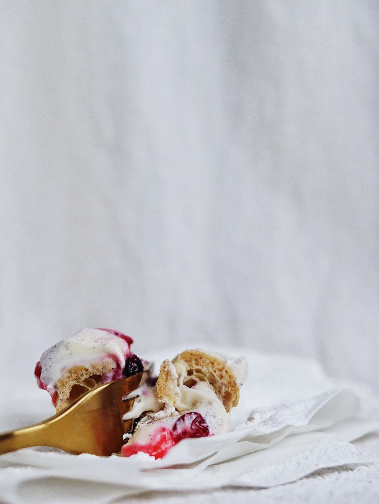 Aztán hazajöttünk, összeraktam őket és rájöttem, hogy ezekre a könnyeden lágy, tejszínhabbal finoman kikevert vaníliakrémes égetett tészagombóckákra nincsenek is igazán szavak. A közepe chia magos erdei gyümölcs dzsemet rejt, amit a múlt heti tökmaglisztes kakaós süteményhez készítettem. A receptet megtalálhatjátok ott, de egyébként bármilyen lekvárral vagy dzsemmel szuperül funkcionál. A második krémréteget az antioxidánsban gazdag Grapoila vörös szőlőhéj őrlemény felhasználásával készítettem. Savanykás, gyümölcsös íze tökéletesen passzol a belsejébe rejtett dzsemhez!