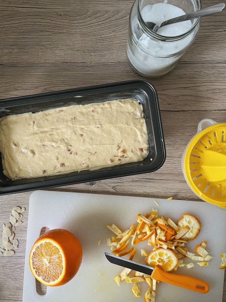 Weiche Butter, Puderzucker und Vanillezucker in einer Rührschüssel mit dem Mixer weiß-schaumig rühren dann die Eier einzeln dazugeben, die Orangensaft und die Orangenextrakt unterrühren. Mehl, Backpulver, Prise Salz, Kardamom, Zimt und kandierte Orangen mischen und kurz unter den Teig rühren. Den Teig in eine gefettete Kastenform füllen, Oeangenscheiben abdecken, geschnittene Mandeln streuen und ca. 40-50 Minuten bei 180° Grad Ober/ Unterhitze backen. Wir haben es mit Vanilleeis gegessen.