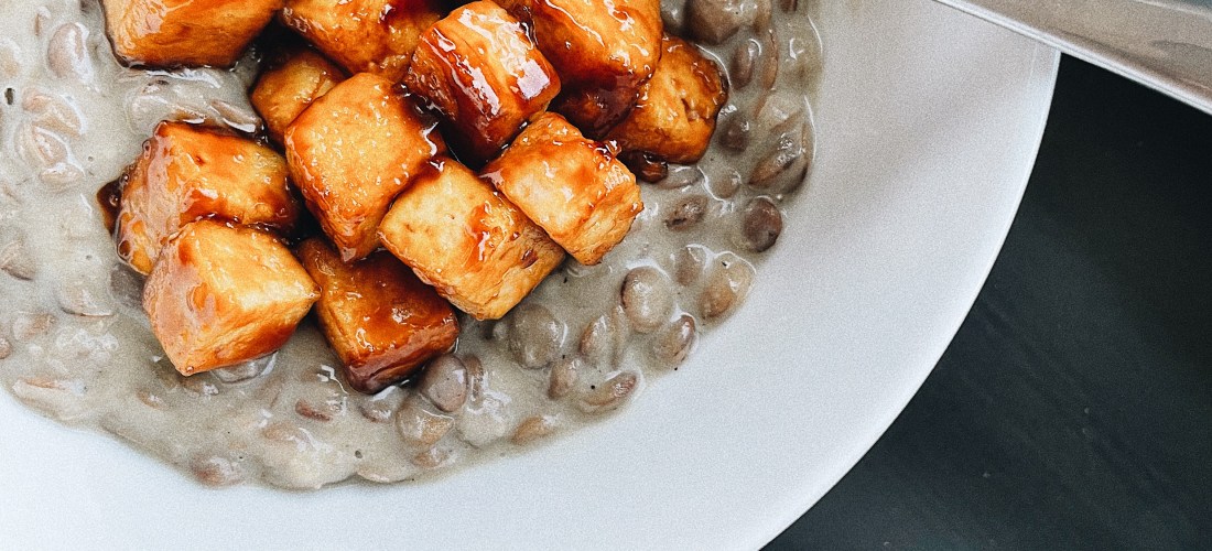 A lencsét előző este beáztatjuk, min. 12 órával az akció előtt. Ekkor leöntjük róla a vizet, felöntjük újra, beletesszük a félbevágott vöröshagymát, a fokhagymát, a babérlevelet, sózzuk, borsozzuk. Fedő alatt puhára főzzük, majd a zabtejszínben elkeverjük a lisztet v. keményítőt és a mustárt, majd besűrítjük vele a lencsét. A szaftos tofuhoz a tofut 1×1 cm-es kockákra vágjuk, megforgatjuk a keményítőben és kis olajon minden oldalát lepirítjuk kb 10 perc alatt. Abban a tálban, amiben összeforgattuk a keményítővel a tofut, elkeverjük a szójaszószt egy kis keményítővel. Hogyha megpirult, levesszük alatta a lángot és elkeverjük benne a szójaszószt, amit rögtön összekap szaftosra a keményítő.