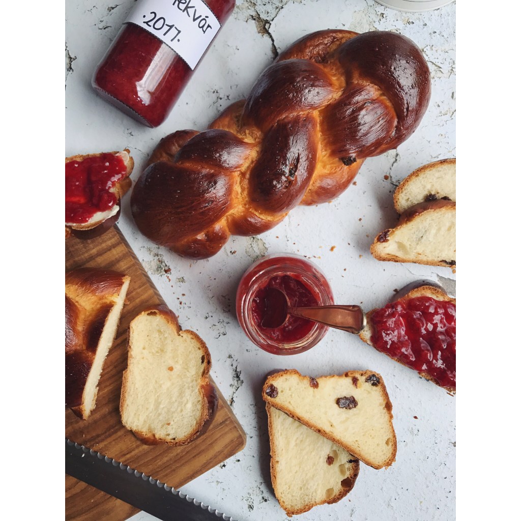 A nagyhetet egy teljesen bolti élesztőmentes, kovászos teszt-kaláccsal kezdtem. Ezt a receptet aztán a hétvégére tökéletesítettem és egy gyönyörű fonott kalács sült ki belőle, ami eszméletlen ízharmoniát alkotott a sós, húsvéti parasztsonkával és a főtt tojással. Emellé készült ez a kakaós-mazsolás cifra csoda, ami vajjal és lekvárral megkenve rögtön a család kedvence lett. Ki sem bírtuk, hogy ne vágjuk meg idő előtt, pedig eredetileg Egerben terveztem megkóstolni. ÁLOM.