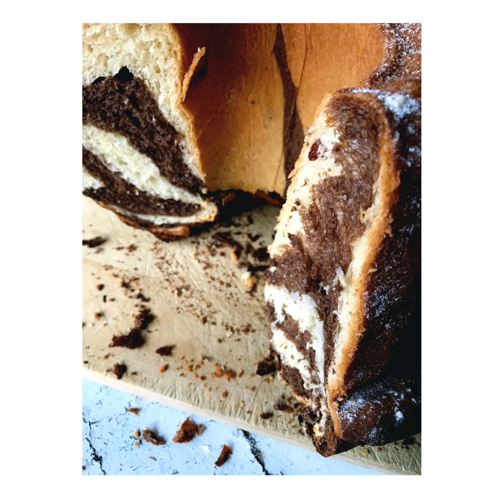 Kettévágom a tésztát. A kakaóport elkeverem 2 evőkanál langyos tejjel, majd az egyik tésztába beledagasztom. Két külön edénybe teszem a tésztákat. Letakarom konyharuhával és 1,5 órán keresztül kelesztem. A megkelt kakaós és sima tésztát kettévágom, így 4 gombócom lesz. Egyenként kinyújtom őket vékony téglalap alakúra. Egy sima tésztára kerül egy kakaós, majd bejglihez hasonlóan feltekerem őket a hosszabbik oldalánál. A két tésztarudat 2-3x összefonom/csavarom.