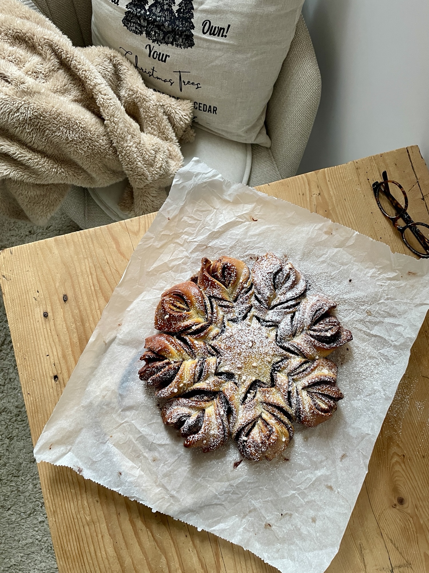 A lisztez a cukrokat és a sót elkeverjük. Az élesztőt langyos tejben felfuttatjuk, majd a liszthez öntjük, majd a tojást és a vajat is hozzáadva a robotgép dagasztó karjával tésztává dagasztjuk. Átgyúrjuk, gömbölyítjük és letakarva 1 órán keresztül a duplájára kelesztjük. 6 egyenlő részre osztjuk, 30 percig kelesztjük. A töltelékhez a vajat kis lábasban megolvasztjuk, majd elkeverjük a csokival, rummal, sóval és a porcukorral. A lapokat 25-30 centis körré nyújtjuk, 3 lap alkot egy csillagot, köztük csokis krémmel kenjük. Közepére illesztünk egy kisebb poharat, hogy bejelöljük a középső részt és körülötte 16 részre vágjuk, kettesével csavarunk rajtuk, végeiket összecsípjük. Tetejüket felvert tojással kenjük. 30 percet pihentetjük, majd ismét lekenjük és 175 fokra előmelegített légkeveréses, gőzös sütőben 25 perc alatt megsütjük.