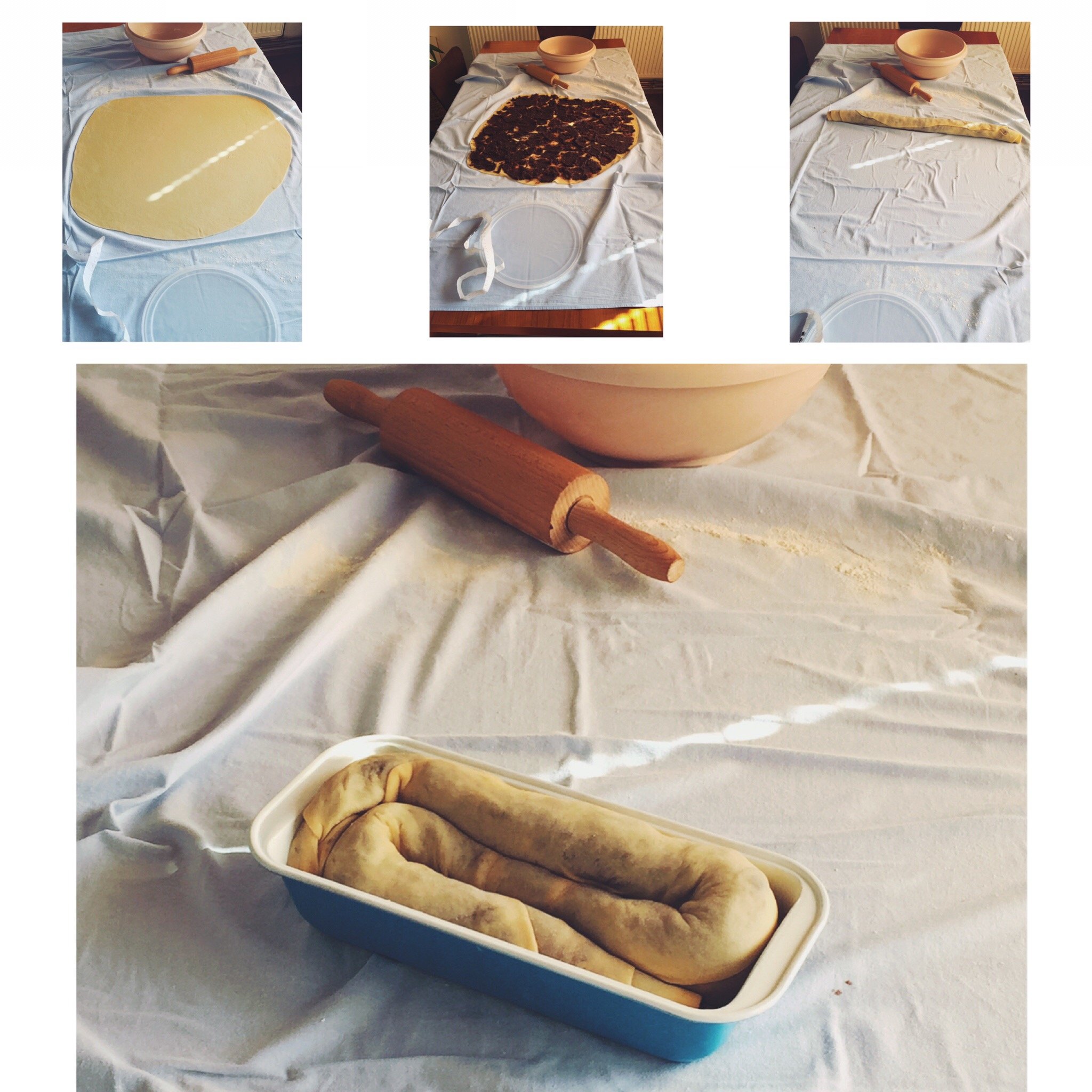Közben elkészítem a tölteléket. Ledarálom a diót. Elkeverem benne a porcukrot, a kakaóport, a vaníliás cukrot, a mazsolát, a fahéjt, a szerecsendiót. Belereszelem a narancs és a citrom héját. Felmelegítem a tejet, megolvasztom benne a vajat. Ha megolvadt, de nem forró csak éppenhogy langyos, beleütöm a tojássárgáhát, belekeverem a rumot és kézi habverővel csomómentesre keverem, majd a dióhoz öntöm és összekeverem. Előkészítek egy tiszta lepedőt/asztalterítőt. Kiterítem az ebédlőasztalra. (Kép lent!) Megszórom liszttel a közepét. Ráhelyezem a megkelt tésztát és nyújtani kezdem. Kb 65×65 cm-esre kell kinyújtani. A végén már a kezemmel húztam.