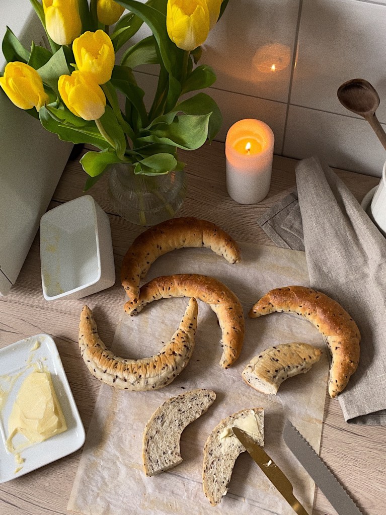 Ezek az apró változtatások mennyit tudnak dobni az eredményen!? – most lenmag és egész köménymag került bele, – véletlenül több olaj zuttyant bele, – igazi, eredeti kiflire formáztam, nem csak simán gyorsan feltekertem, – sütés előtt & után vizes ecsettel lekentem őket.