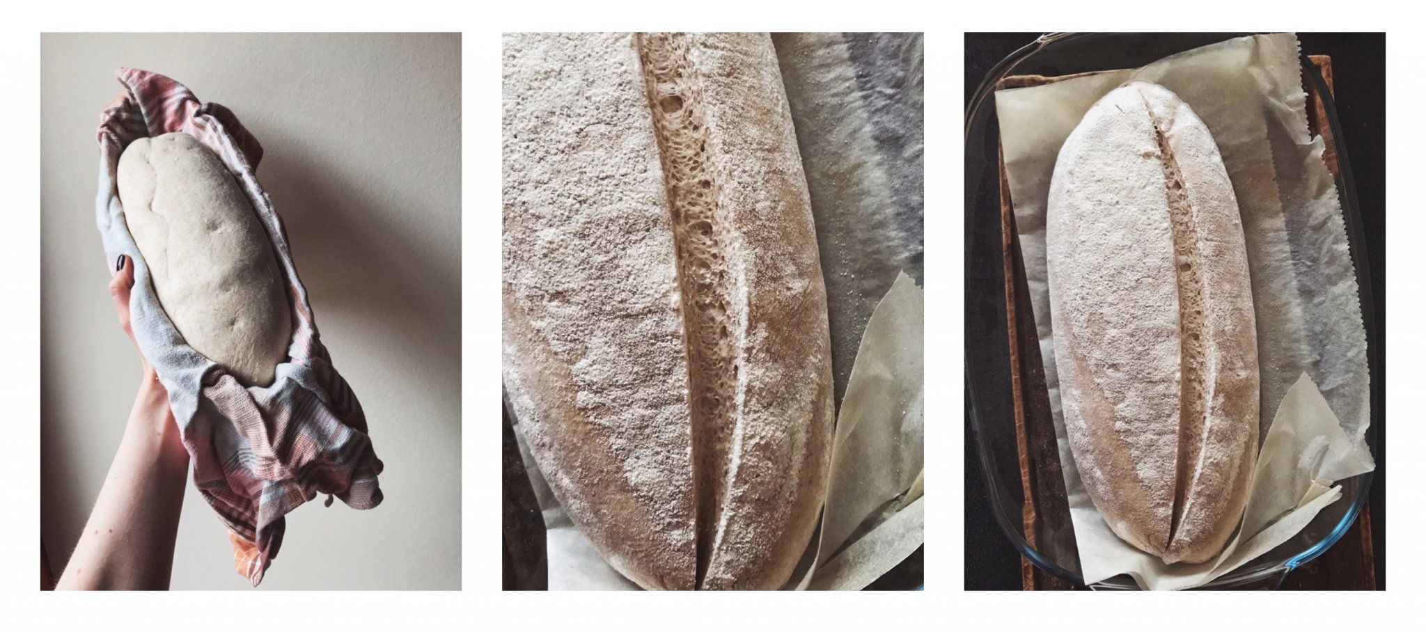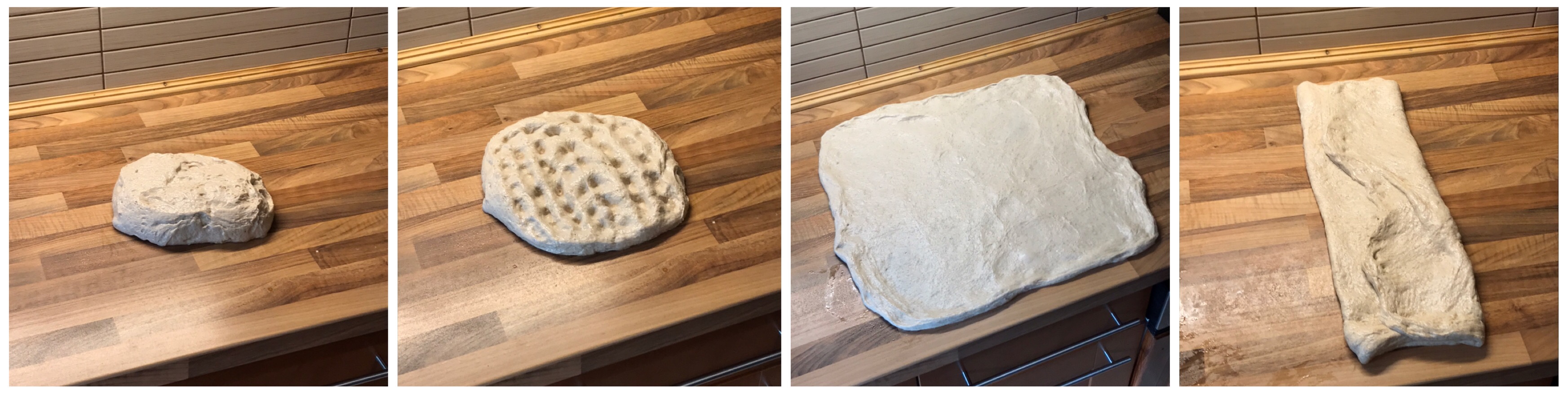 Lisztezés helyett én vizezem a pultot, átspricceltem a virágspriccelős, direkt erre a célra vásárolt ikeás spriccelőkémmel jó bőven, majd ráfordítottam a tálat és hagytam, hogy a tészta magától kicammogjon. Ujjbegyeimmel téglalap alakúvá nyomkodtam finoman. Majd alányúltam és, mint a rétestésztát akkorára kihúzogattam minden oldalát, amekkorára engedte magát, vagy attól függően mekkora helyünk van a pulton! :D Szuperül tudunk ezzel a mozdulatsorral levegőt csempészni a kenyerünkbe. Összehajtogatjuk, mint a leveles tészta szimpla hajtását, de alapvetően mindegy, hogy hogy akrobatikázunk vele, lényeg, hogy jobbról is, balról is hajtsuk be, aztán fentről is középre, lentről is középre, megfordít és tádám lőn cipó. (Képeken lentebb látjátok!)