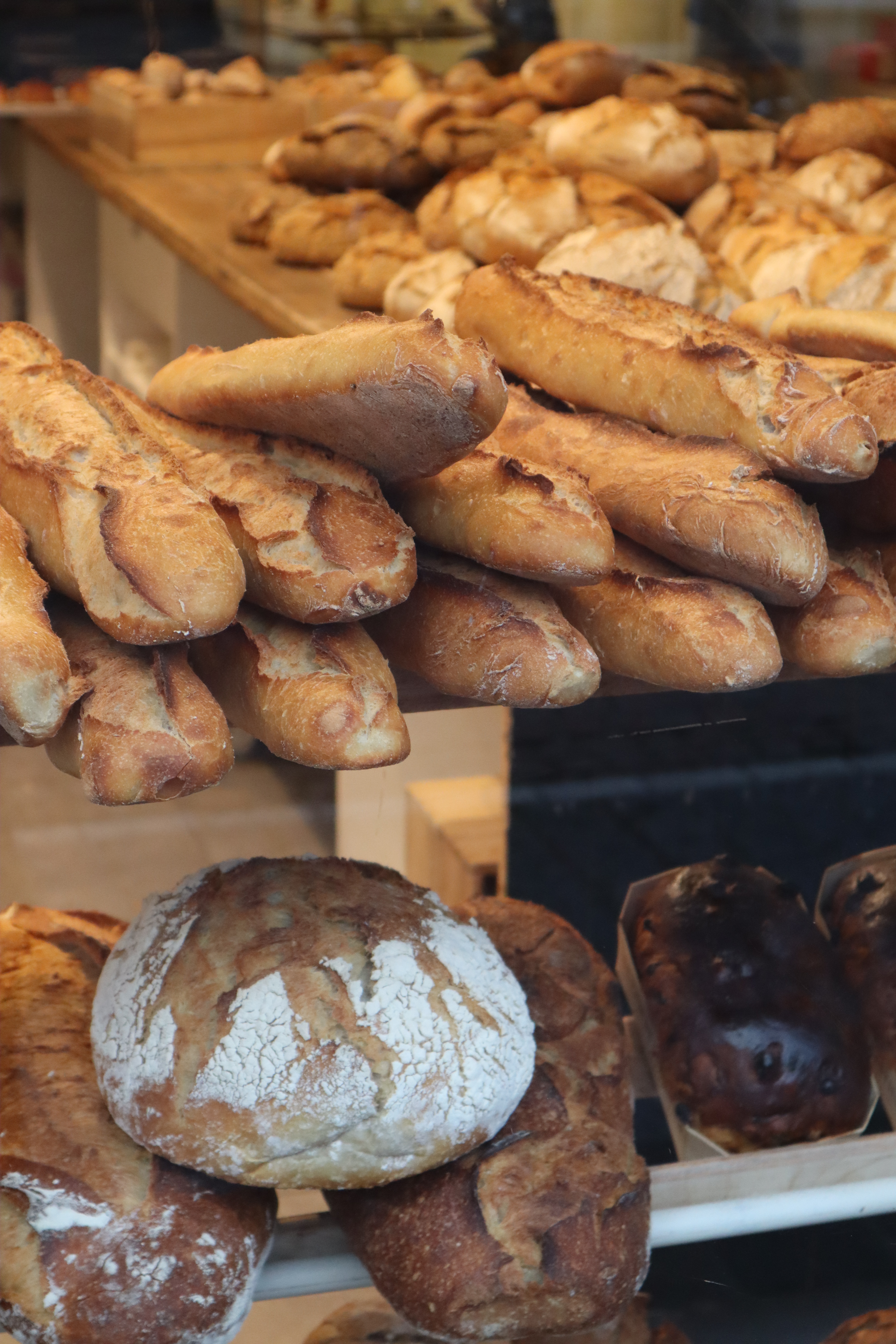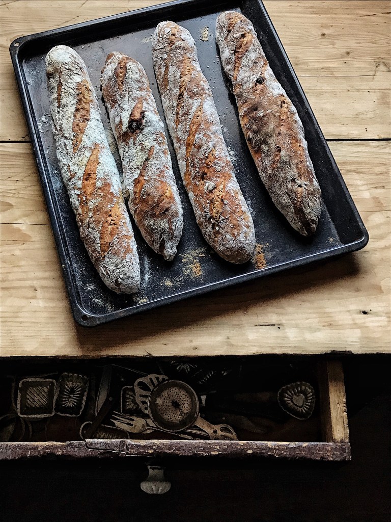 Reggel tepsivel együtt előmelegítjük a sütőt 250 fokra. A tésztát finoman lisztezett pultra borítjuk, majd tésztavágóval zsemlényi szeletekre vágjuk lehetőleg úgy, hogy ne nyomogassuk ki belőle a levegőt és sütőpapírra tesszük. Ez elég nehéz és ragacsos feladat, de ennyi benne a “melós” rész. Nálam egy tepsire 6 db került, felületükre bő vizet spricceltem és 250 fokon 10 percig, majd 200 fokon ismét 10 percig sültek ropogósra.