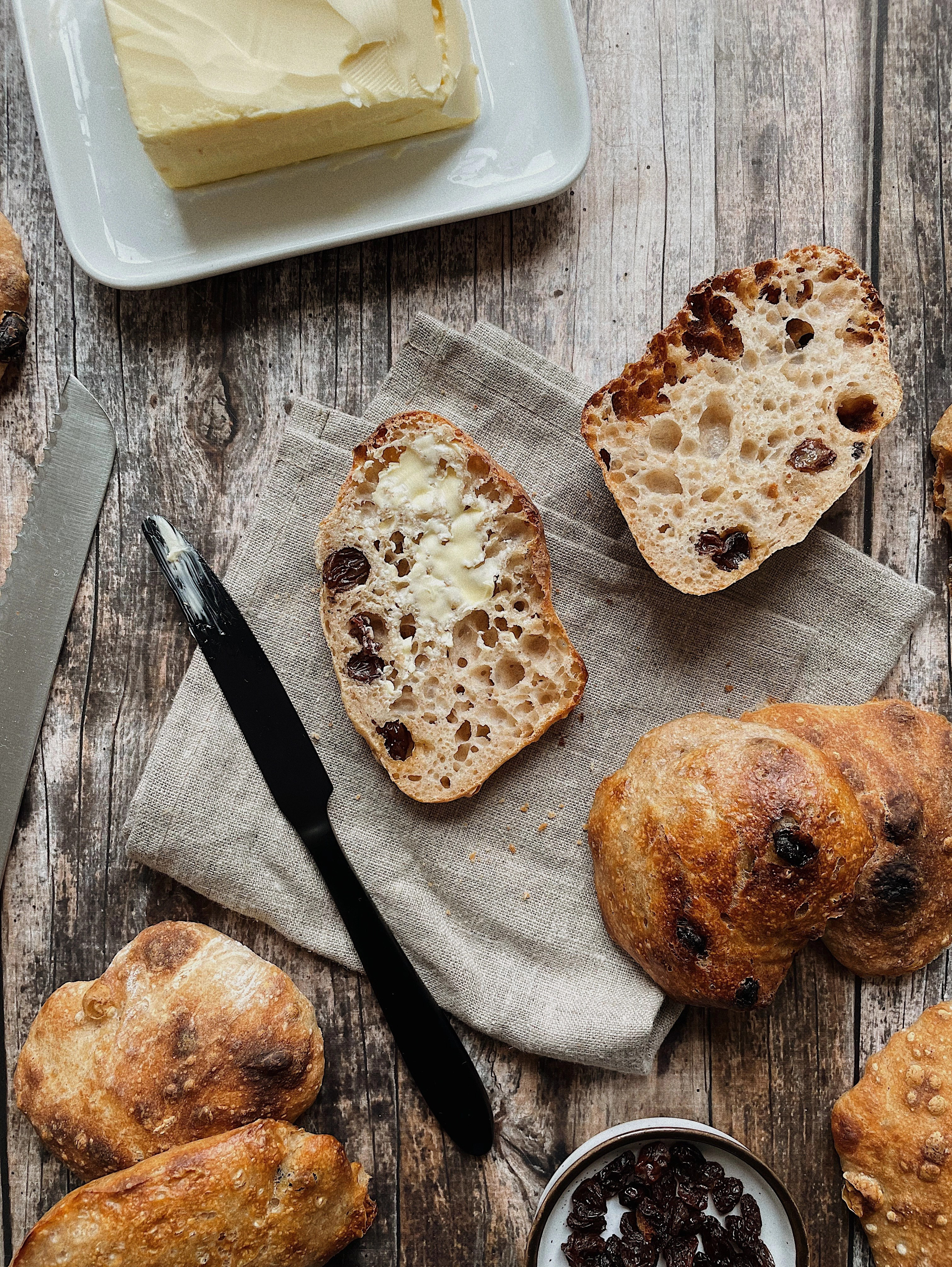 A Kenwood robotgépem táljában elkeverem a vizet a kovásszal, az instant élesztővel és a cukorral, majd beleszórom a lisztekkel jól elkevert sót és a K alakú pillangókarral 12 percig először közepes, majd kicsivel magasabb fokozaton keverem. Elképesztően hidratált tésztáról beszélünk, lágyabb lesz, mint a nokedli és az elején teljesen reménytelennek fog tűnni, de a végére szépen kialakul a tészta glutén szerkezete, a kavarás közben láthatóak lesznek a tál széléről húzott tésztaszálak. Akkor lesz jó, hogyha vizes kézzel szép átlátszó vékonyra tudjuk húzni, anélkül hogy rögtön elszakadna. Ekkor fogjuk és átöntjük egy olívaolajozott tálba, amit vizes konyharuhával letakarunk és 4 órán keresztül a pulton kelesztjük. A harmadik órában eszembe jutott a mazsola, beleszórtam és kicsit áthajtogattam, majd egy óra múlva hűtőbe tettem reggelig.