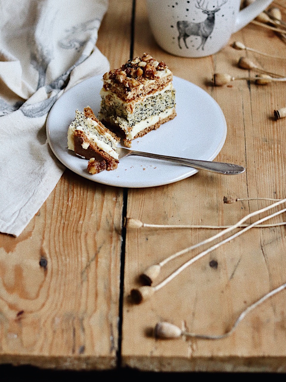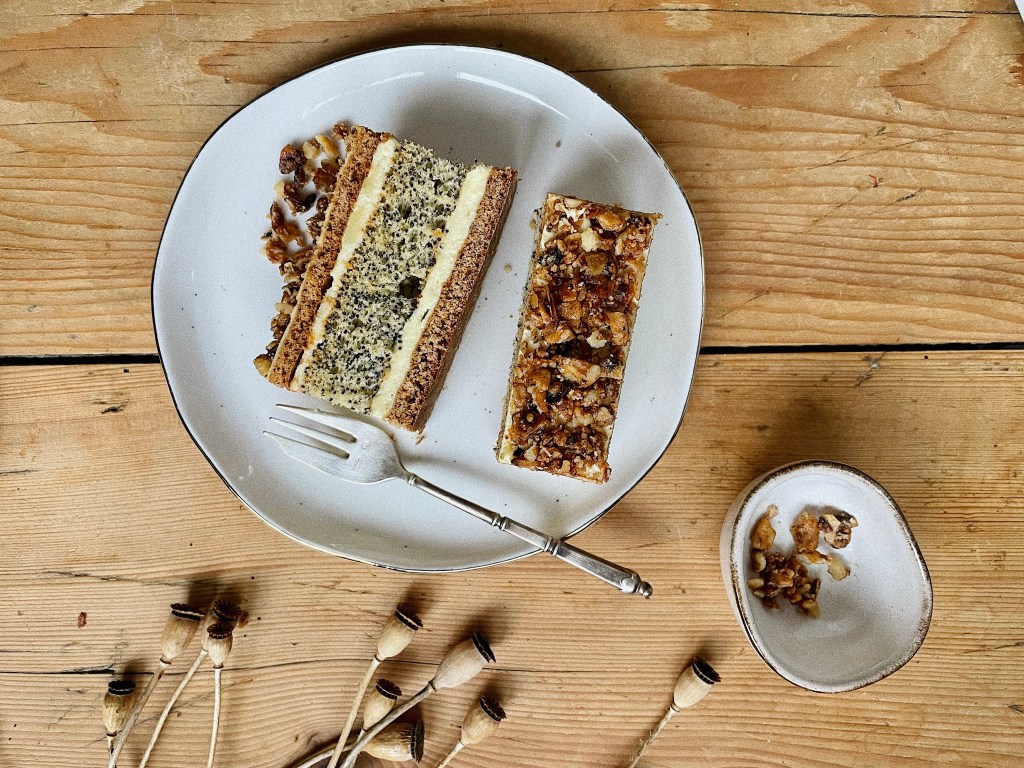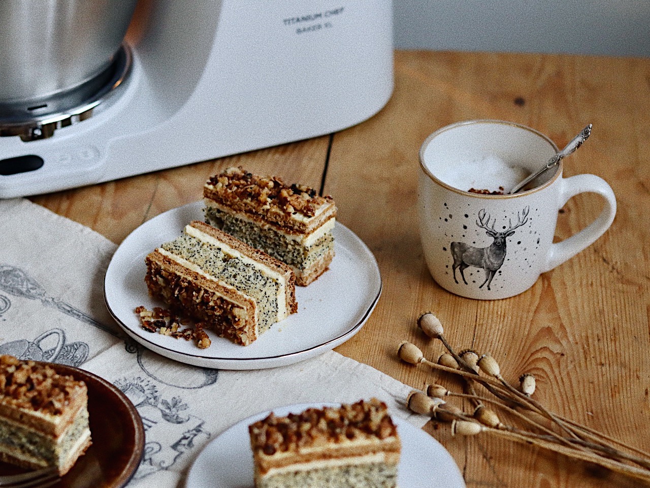 Mézes lapok és főzött, habos vaníliás könnyed vajkrém öleli körül a szaftos, puha, egész mákszemekkel kevert piskótát, a tetején vékony krémrétegen karamellizált dió-mandula páros terül.