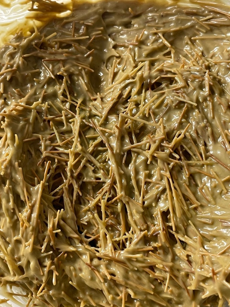 A töltelékhez a cérnametéltet kisebb darabokra törjük és serpenyőben megpirítjuk, majd összekeverjük a pisztáciakrémmel.
