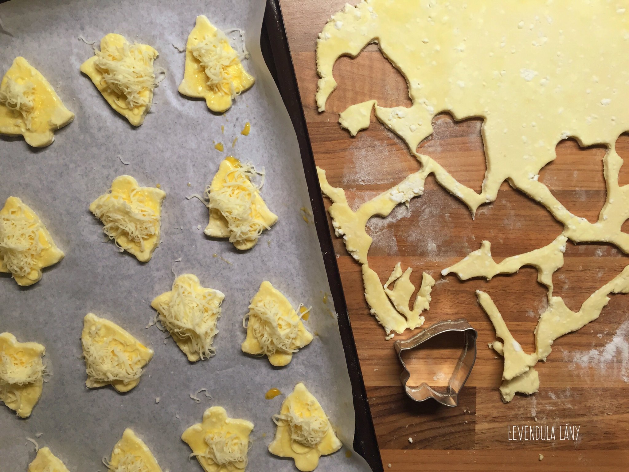 Langyos tejben elkeverjük a porcukrot, belemorzsoljuk a friss élesztőt, felfuttatjuk. A lisztet összekeverjük a sóval, az apró lyukú reszelővel lereszelt sajttal, majd összemorzsoljuk a vajjal és a zsírral. Beleöntjük a felfutott élesztőt és a tejföllel együtt összeállítjuk a tésztát. Hűtőbe tesszük 30 percre. Enyhén lisztezett deszkán 0,7 cm vékonyra nyújtjuk, felületét lekenjük villával kicsit felvert egész tojással, majd bőven megszórjuk az apróra reszelt sajttal. Pizza vagy derelyevágóval csíkokra vágjuk, majd hosszában is felszeleteljük őket. Sütőpapírral bélelt tepsire sorakoztatjuk és 190 fokra előmelegített sütőben (alsó-felső) 15-17 perc alatt megsütjük.