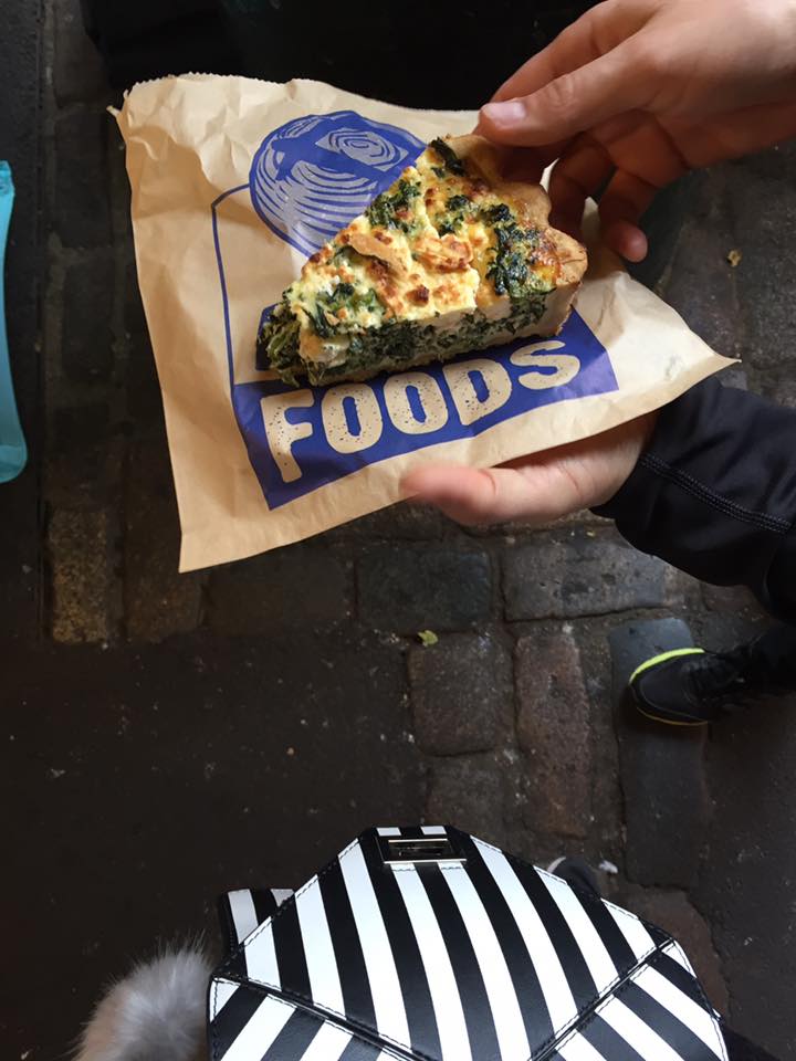 Mazsolás scone a legelső sarki Patisseriében, fish and chips a fish!-nél a Borough Market-en, Franco Manca kovászos pizzája, levesezés az Itsuban, cukros-fahéjas cruffin a GAIL’s Bakery-ben, egy reggeli a PAUL-ban és spenótos quiche, szintúgy, a Borough Market-en.