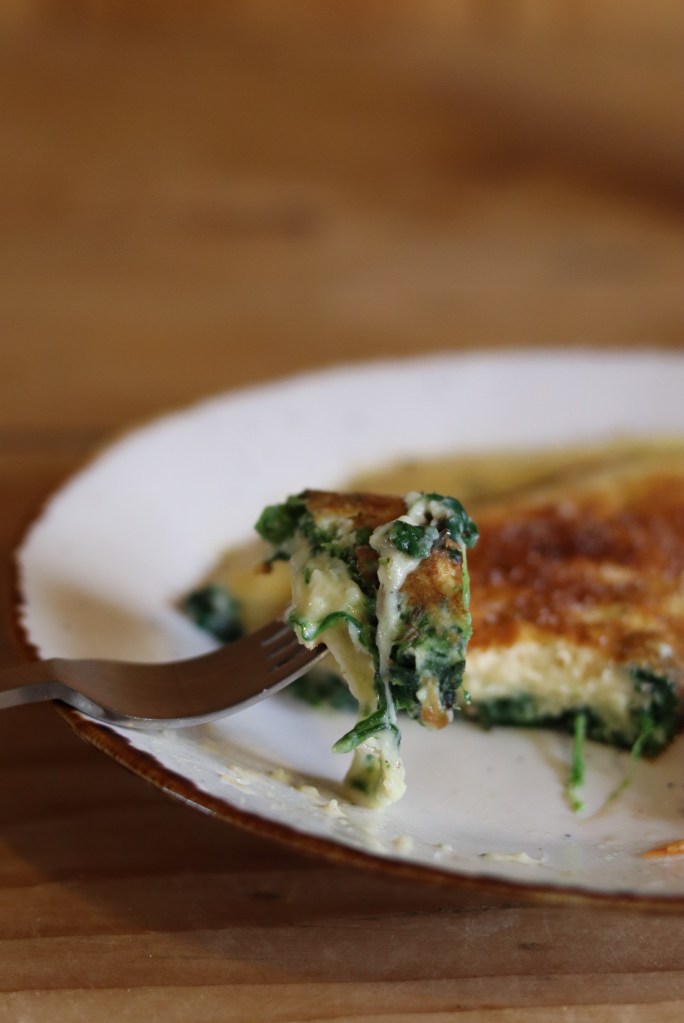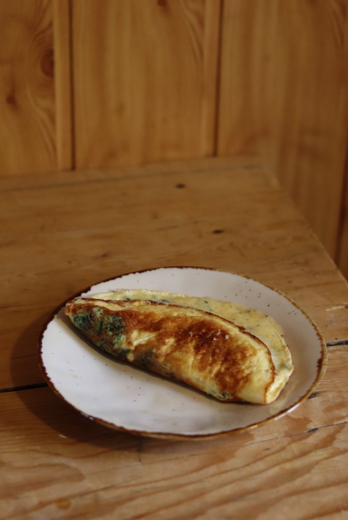 Egy 26 cm-es serpenyőben vajon megpirítjuk az apróra vágott fokhagymát. A tojásokat egy tálba ütjük, belereszeltjük a sajtot, sózzuk, borsozzuk, hozzáadjuk a tejfölt és villával kicsit felverjük, elkeverjük. A serpenyőt lehúzzuk a tűzről, hagyjuk kicsit hűlni, majd beleöntjük a tojásos masszát. Az omlett felébe beletépkedjük a mozzarella felét, rápakoljuk a leveles spenótot, jöhet a mozzarella másik fele, végül megszórjuk parmezánnal. Visszarakjuk a tűzre. Ha az alja kellően megpirult, félbehajtjuk és tovább pirítjuk, amíg a közepén elkezd folyni a sajt. Sok salátával, paradicsommal esszük.