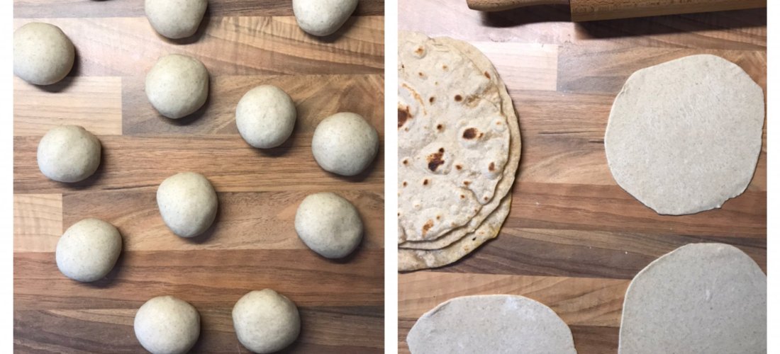 A liszteket átszitálom, elkeverem benne a sót, a cukrot és a sütőport. A közepébe mélyedést készítek, beleöntöm a vizet és az olajat. Fakanállal összekeverem, majd amikor már nagyjából összeállt, leszedem a fakanálról a tésztát és a kezemmel folytatom a gyúrást, majd kiteszem a pultra és szép tésztává dagasztom. Nem kell sokáig 1-2 percig gyúrom. Felosztom 75 grammos egyenlő darabokra és egyenként gömbölyítem, 15 percig letakarva pihentetem. Enyhén lisztezett felületen kinyújtom. Van egy pont, amikor már nem nyújtható tovább, ekkor hagyom egy picit pihenni 2-3 perc. Addig felforrósítok a serpenyőt, majd visszatérek a tésztához, kezembe veszem és szépen, mint a rétestésztát, vagy mint a pizzát meghúzom minden irányba, körbe-körbe végighaladok így rajta és a forró serpenyőbe teszem.