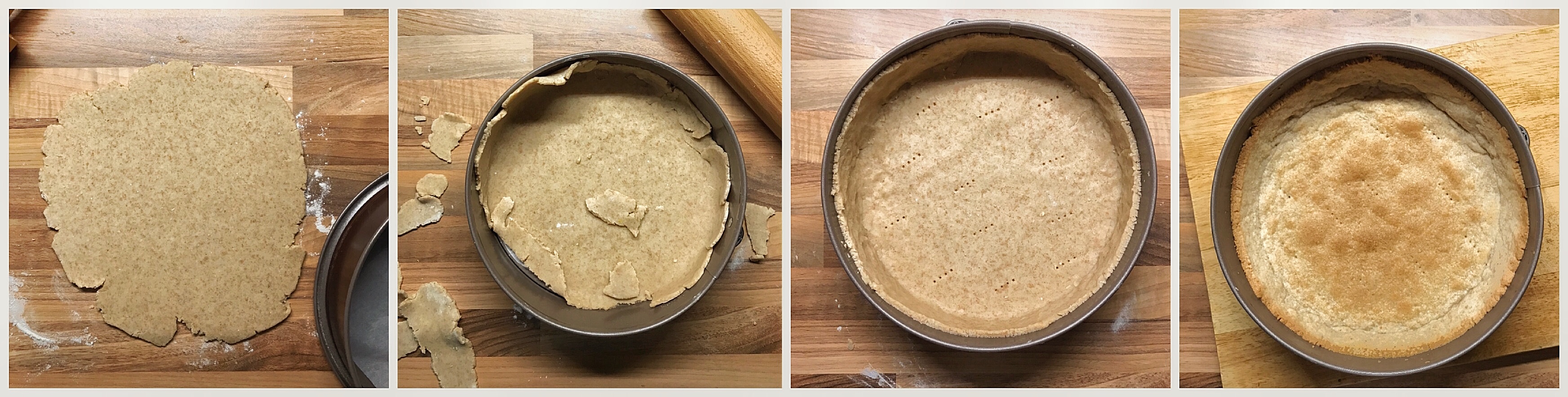 Tészta elősütése. Egy 22 cm-es kapcsos tortaforma alját kibélelem sütőpapírral. A tésztát akkorára nyújtom, hogy az oldalára is fel tudjam tapasztani, mert jó sok töltelék kerül majd bele. Szóval átpakolom a tésztát, nekem fullba szétesett a széle, mert teljes kiőrlésű, de visszalegóztam és gyönyörűen levágtam a széleit, szóval igen mutatósra sikerült! Villával vagy 9x megszurkáltam az alját, majd 190 fokra előmelegített sütőben 10 percig sütöttem.