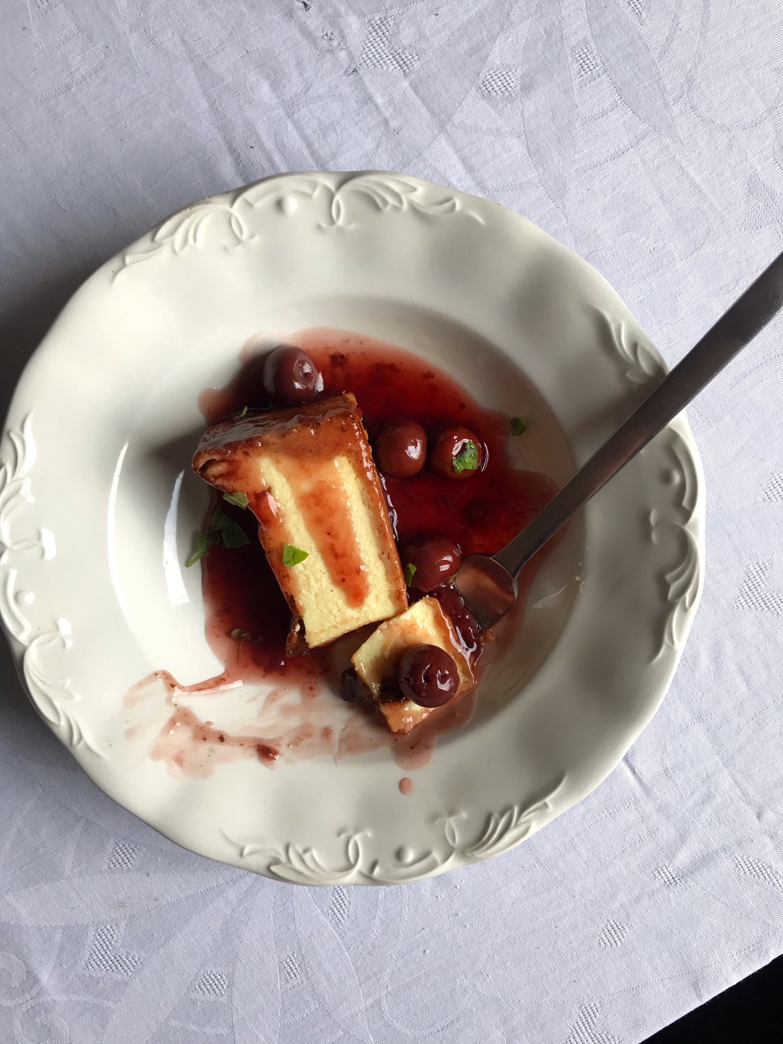 Sült túrótorta bazsalikomos meggy-eper szósszal