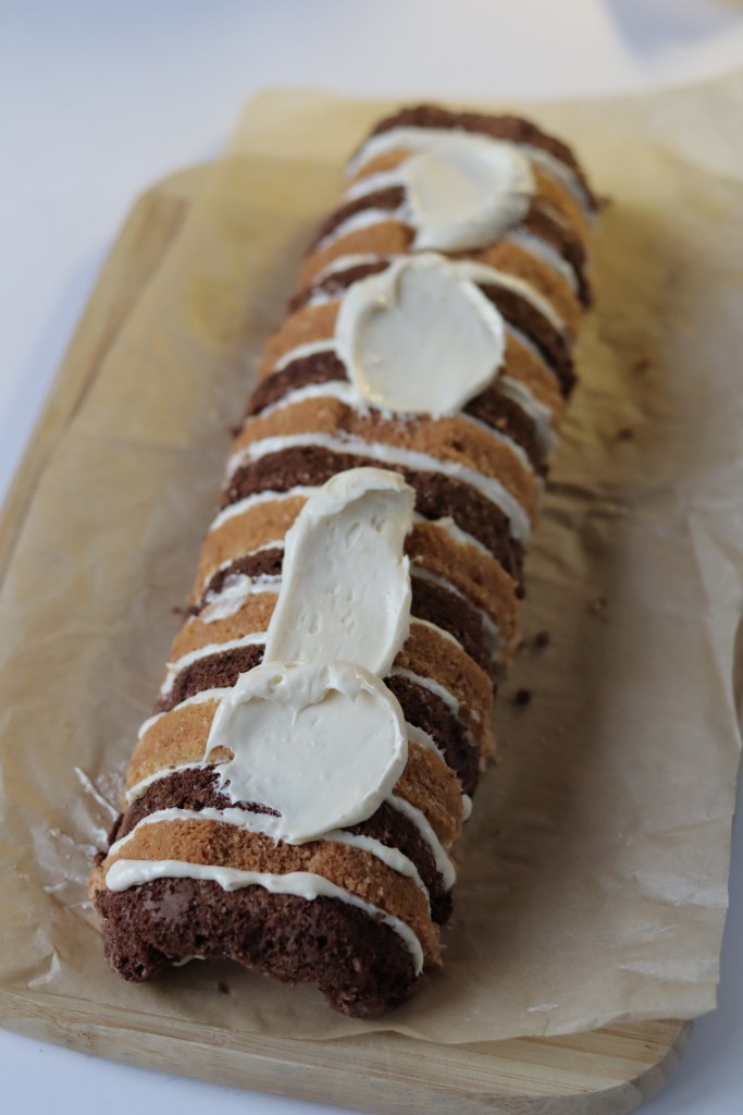 A piskótákat 1 cm széles szeletekre vágjuk, lényegében az őzgerinc forma barázdáinál szeleteljük. A szeleteket krémmel kenjük, majd egyenként összeragasztjuk őket, majd egy vékony rétegben bevonjuk a maradék krémmel, de ne használjuk el az összes krémet. Hűtőbe tesszük dermedni 1-2 órára (esetemben egy éjszakára). Másnap a krémkabát “hibáit” a maradék krémmel kijavítgatom.