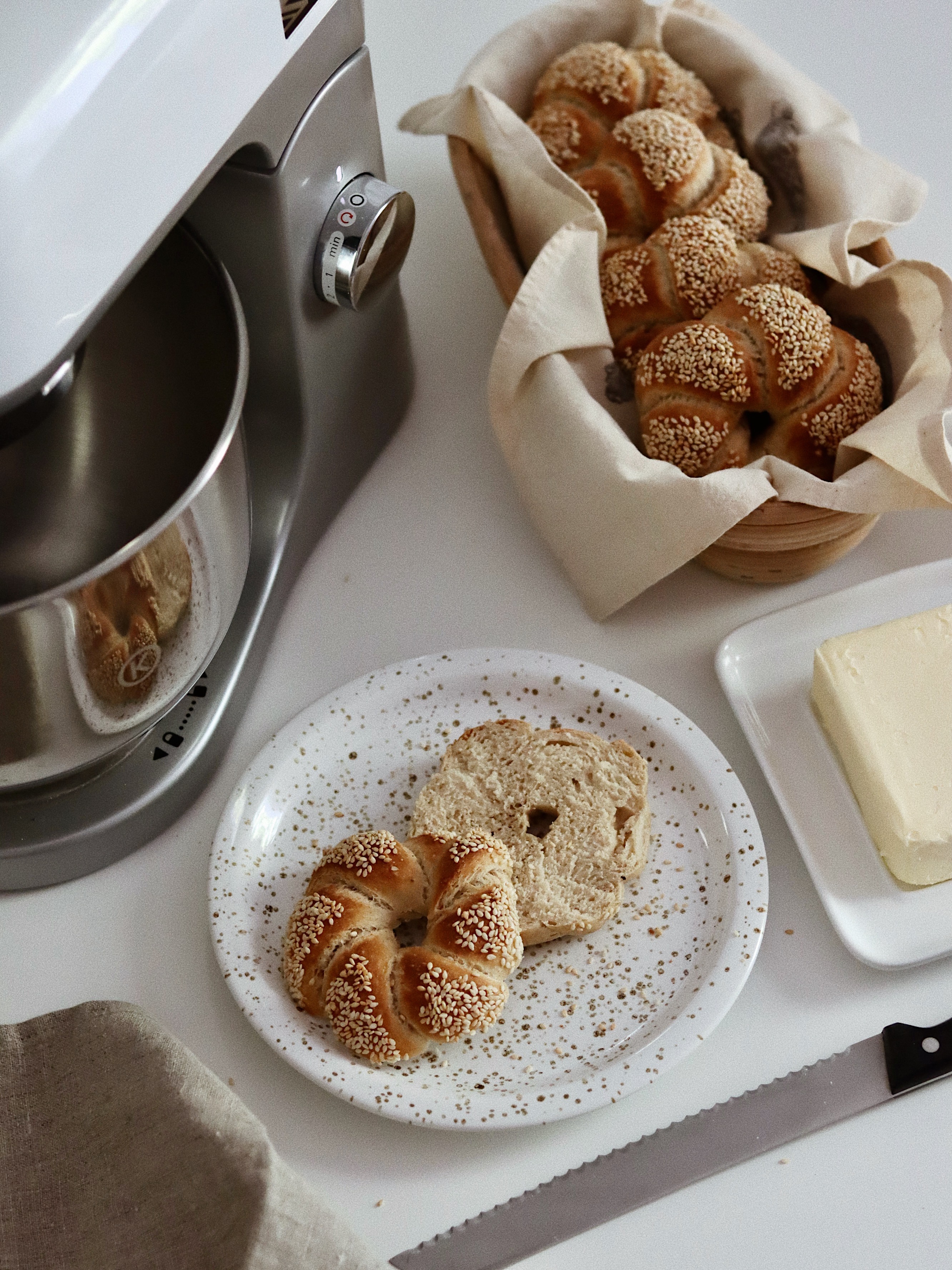 Jöhet a császárzsemle forma kialakítása. Kezünkbe vesszük az első gombócot és kilapítjuk, majd bejglihez hasonlóan szorosan feltekerjük és ezután sodorjuk. Ez a lapítás-tekerés azért fontos (KALÁCSNÁL MÉG INKÁBB!) mert így nem lesz “narancsbőrös” a tésztaszál felülete, szóval így lesz szép egységes és egyenletes. Oké, van egy 40 cm-es szálunk, amire laza csomót kötünk és a végeit körbefonjuk a kör alakú tésztán. Sütőpapírral bélelt tepsire sorakoztatjuk őket. Két mélytányérra lesz szükségünk, egyikbe engedünk egy kis vizet, másikba beleöntünk kb 4 evőkanál szezámmagot. A zsemlék tetejét belemártjuk a vízbe, majd beletesszük őket a szezámmagba és visszahelyezzük a tepsire, ahol még 20-30 percig pihennek. Sütés előtt a kezünkkel lespricceljük őket vízzel.